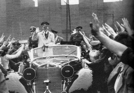 German police and troops are reviewed by Heinrich Himmler who stands under a giant tapestry.