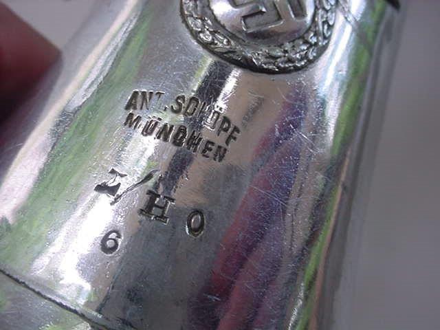 DESCRIPTION: Here's a wonderful glass mug that was obviously presented to the "B�rgermeister" (mayor) of some German town. His name is displayed on the top�"L. M�ndel." It wonderfully displays the sacred German oak tree, which has much legend in not only German, but Roman, English, and other countries' cultures, as well. In the 8th century, the Christian clergyman, Boniface, had his men cut down the sacred tree where Germans would gather. It was well known to the Romans there as the "Sacred Tree of Jupiter," but the Germans called it the "Sacred Tree of Donar/Thor." Boniface then cut the tree up and made a church out of it to the tremendous dismay of the Germans. But throughout German history, the tree was sacred and whoever made this mug wanted to convey that great fact and its relationship to National Socialism where "Heil Hitler" is on the thumb part. The most outstanding part of this is that under the "Heil Hitler" is a date "30-1-33." That is the date Hitler was named Chancelor of Germany. Having been personalized, it is a one-of-a-kind mug that makes it more attractive historically. It's made of glass and the lid is pewter. On the side an inscription indicates the capacity is 10/20 liters. There is a crown-maker�s mark on the bottom, but I cannot identify the manufacturer. It's in perfect condition.