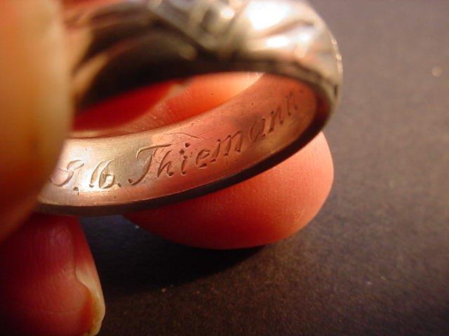 This is an excellent example of the SS Ehrenring (Honor Ring). It was presented by Heinrich Himmler on 9-11-41 to Karl Thiemann, who was also a recipient of the Honor Sword. His NS Party number was 331 077; SS number was 290 633. He was born on October 22, 1894, and was promoted to SS-Obersturmbannf�hrer (lieutenant colonel) on 10-9-39. He was attached to the RSI Hauptamt (the headquarters of the Reichsf�hrer-SS Heinrich Himmler). The ring has the official certification of Mr. Don Boyle who wrote the book SS Totenkopf H. Himmler Honor Ring 1933-1945. Mr. Boyle gave this certification to the former owner of the ring, Mr. Sonny Kimball, on February 22, 2019. Don says of this ring that it has the nice, compulsory seam and there is some wear to the skull and bottom runics. Without Boyle�s certification these Honor Rings are hard to document. The ring obviously has been cleaned and the Himmler name inside is a bit hard to read without magnification. The teeth of the skull are worn, but evident. Overall, the ring could be classified as at least �good.� It is in a size 11, which is the size most desired among collectors. The inscription inside is quite clear and it has the obvious seam underneath the skull. A good, honest SS-Ehrenring is seldom found today, but very much sought after by collectors. This won�t be with us very long so I suggest if you ever wanted one of these rare pieces, act now.
