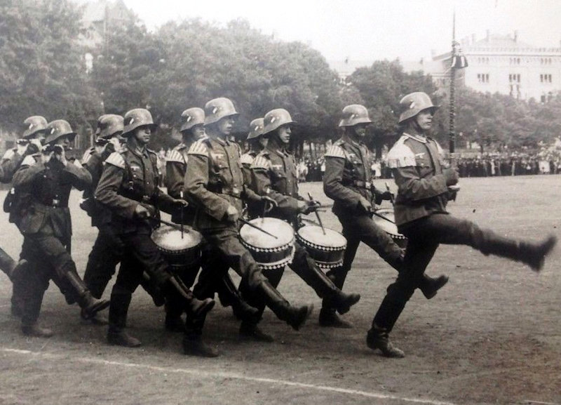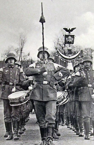 Here is a photograph of Wehrmacht bandsmen at the ceremonies on Hitler's birthday April 20, 1939. Note how the bugles are worn at parade