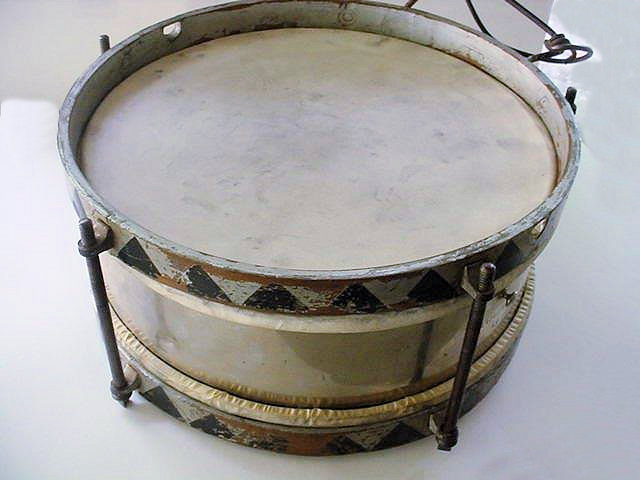 DESCRIPTION: We were quite fortunate to have been able to acquire this very rare SS musical instrument. It is in remarkable condition and both drum heads are intact. These are seldom encountered while the Hitler Youth-style shows up from time to time. The coloration makes the difference. The SS drums always have triangular design in black and silver while the Hitler Youth drums are in the national colors of black, white, and red, and usually had a flame design. It has been many years since we have seen one of these SS drums offered. The condition shows much usage and it has the iron belt hanger attached. It measures 15 inches across its top and bottom and the drum is 7 inches deep. It bares markings as follows: the SS runics followed by the letters and numbers �M10/21/41.� In this field an SS drum in this condition would merit being acquired by an advanced collector or museum. In our some 50+ years, we have never encountered one of these so we are quite proud of this offering. It would make a great display piece in your collection. This drum would seem ready to beat out the prelude to the SS song �Wenn Alle Untreu Werden.�