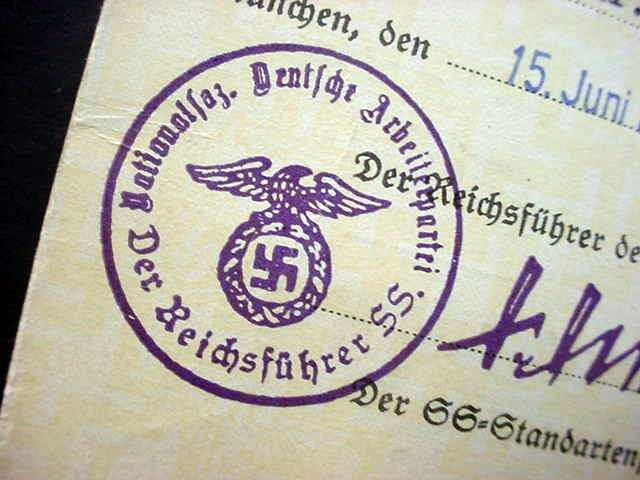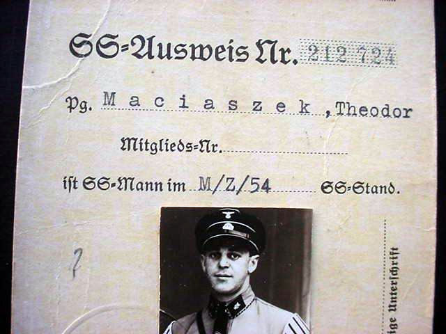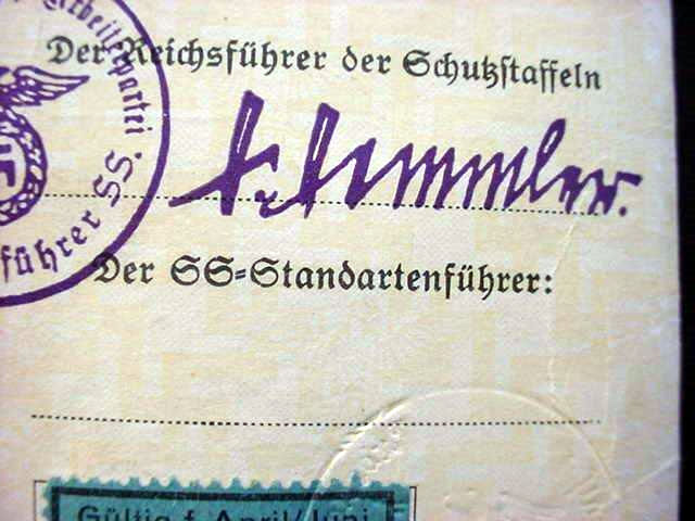 DESCRIPTION: Here is a very rare SS membership card with the picture of an SS trooper wearing the early brown shirt circa 1934 one year after the Machtergreifung (assension of power). In the heading printed is �Schutzstafteln der NSDAP� and under this the man�s SS Ausweis number �212 724� then the initials �Pg.� (the SS initials for what translates to �Party Member� [ Parteigenossin ] and then we see the man�s name, �Maciaszak, Theodor.� His member number, however, is left blank. After this are the words �ift SS-Mann im M/Z/54 SS-Stand..� Then you can see that the cap bears the early jawless skull and he wears the epaulettes of a German bandsman that are called �swallow�s nests.� He also wears a musical instrument on his collar tab. Stamped at the edge of the SS man�s picture is an embossed eagle and swastika. Along the side of the card is an instruction that the card should be signed. On the back of the card at the top is his birthdate and he was born 18.VII.1908 in Seegenfelde Kr.(Kreiss) DT. (District Krone).The card was issued in Munich 15 June 1934, and below this is a clear stamp of the office of the Reichsf�hrer-SS stamped over printed words �Der Reichsf�hrer der Shutzstaffel,� and under this is a facsimile signature of H. Himmler as SS-Standartenf�hrer. Below this is an attached blue-paper stamp that says �G�ltig f. April/Juni 1934.� This means basically legally effective at that point in time. This extremely important document is in incredibly excellent condition when it is realized that it is nearly 90 years old. This without a doubt is just about the finest example of an SS Ausweis that we have ever encountered in many years. The other great thing about this SS Ausweis is the fact that this SS man is seen in resplendent traditional uniform, where with a web search all the SS Ausweis holders are seen wearing civilian attire while SS musician Maciaszik was so proud of his chosen corps, he absolutely had to be pictured wearing it.