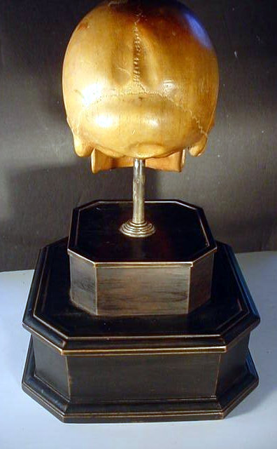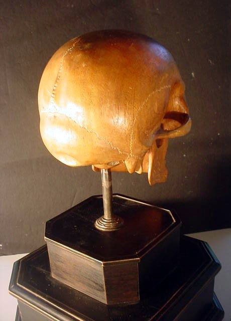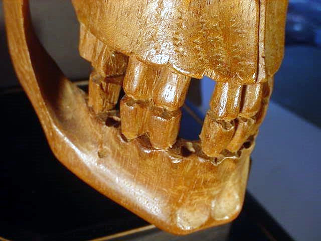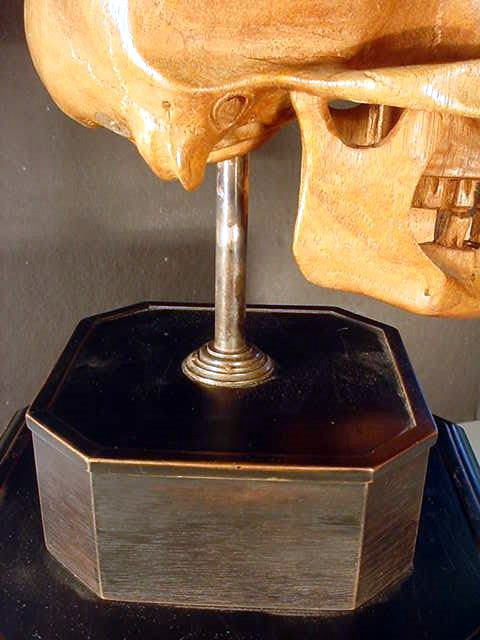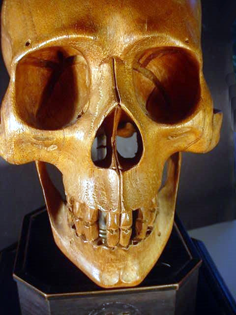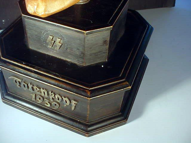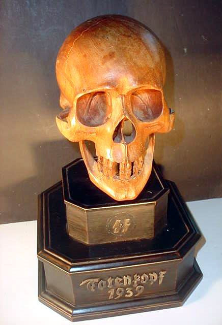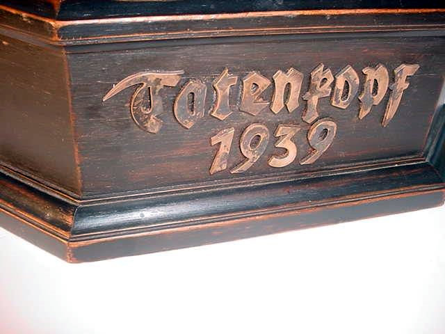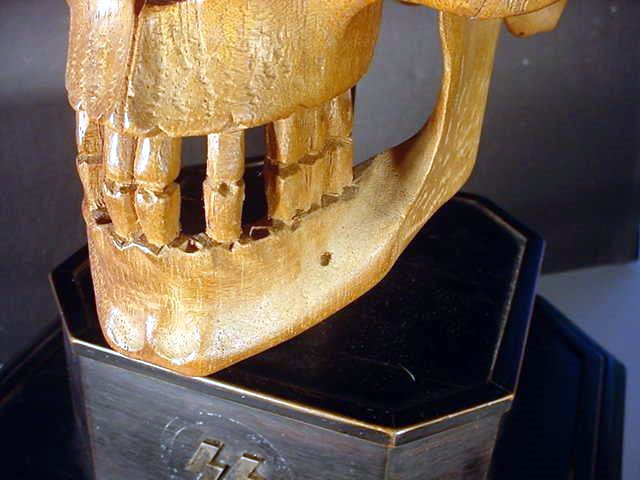 The skull is 100-percent life size and in amazing proportion and has quite an admirable anatomy, so perfect that if it were painted white one would take it for a true human skull (frighteningly realistic). It is mounted on a black, wooden plinth consisting of two fine tiers. Emerging the top of the highest tier is a steel shaft on which the skull is firmly supported. The measurement from the very bottom of the wooden plinth to the crown top of the skull is roughly 17 inches. The measurements of the skull are equal to the measurement of the average human head. The bottom tier of the plinth is about 4 inches high and 25 inches wide across the frontal view, while the top tier is about 3 inches high and 4 inches wide. The skull is entirely hand carved by an artist who was an absolute master woodcarver, and had a great clinical knowledge of the human anatomy, as well. Just the work on the teeth alone is illustrative of the artist�s great accomplishment and his keen and exact perspectives. We believe this masterwork was originally presented in November 1939, and we believe it was destined to adorn the desk of SS-Obergruppenf�hrer and general of the Waffen-SS Theodor Eicke, to commemorate his gaining command of �TOTENKOPF� that later was the famed 3rd SS Panzer Division "Totenkopf." There are silver letters spelling out �Totenkopf� on the face of the bottom and a set ohttps://www.germaniainternational.comnational.com/images/ssascolor2.gif"> runes on the upper tier. Obviously, there was a wreath around the runes at one time, but is now missing.