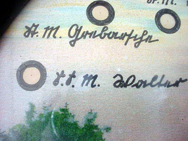 DESCRIPTION: Well, what we have here is actually an well-painted German helmet with Third Reich themes. In fact, it is extremely well painted by a contemporary artist named "Jatving JK." He is an accomplished artist painting with meticulous detail. We cannot find anything about him other than he also did a WWI helmet that had sold. He took a German helmet and coated it inside and out to execute the painting process and turning his helmet canvas into a most impressive piece of artwork. Soldiers are shown on each side and as you can see in the images; he didn�t miss any details in their uniforms, the tank, their faces, etc. But the front of the helmet is adorned with the F�hrer from one of the famous paintings of him in exquisite detail. This cameo portrait is as good or even better than the small, portrait paintings done of Hitler during the Reich. The bullet hole at the top was probably self-executed by the artist to lend a serious, but morbid, detail to the entire scene. We don�t promote the selling of any helmet�German or Ally�with this, but the fine artwork transcends any polemics against Germans. There is no animosity or hatred shown here as we are not talking about a satire of Germans, but just the opposite. His WWI helmet showed the same historical tribute. It's signed by the artist inside. I am really stymied by the artwork. I have sold many wonderful artworks done by Russian painters and this is similar in style and detail. So, if anyone knows anything about this enigmatic artist, please contact us. I can�t help but think that the paintings of this artist will truly be highly desired collector items in the future. For the really novel and unusual Third Reich tribute, this helmet has it all.