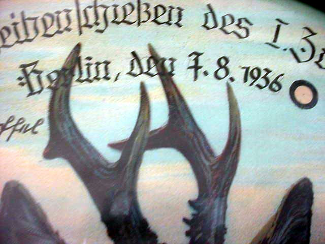 DESCRIPTION: The target is approximately 18 inches in diameter and is displayed in a black, wooden frame, which is its original frame for display and features the period framer's marking on the back. It commemorates a special shooting competition for members of the SS-Leibstandarte in Berlin on 7.8.1936. Along with the date and location information, it's marked "10./ SS A.H." (10th Company SS Adolf Hitler). There are nine bullet holes with the name of the shooter noted on the target. This is a unique and artistic example of early Third Reich military competitive shooting. The overall condition is very good. The animal depicted in the print is a roebuck. This offering is not only exceptionally rare, but ultimately historically important as well!