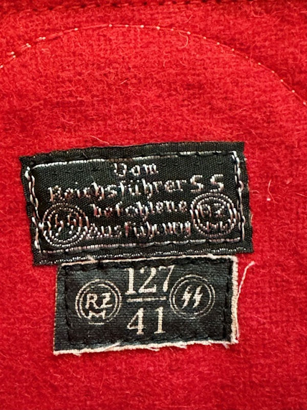 DESCRIPTION: This is a rare, original SS Armband with RZM label. It's of three-piece construction on red wool with black tress bordered running along the whole length on the armband above and below. The white circle has patina. The reverse of the armband is complete with RZM tag with the SS and RZM logo and the inscription �Vom Reichsf�hrer SS befohlene Ausf�hrung� (�Execution ordered by the Reichsf�hrer SS�) numbered 127/41" indicating the manufacturer and date. This rare textbook example has no damage or repairs and would be hard to upgrade.
