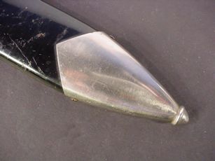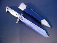 | DESCRIPTION: Here is the enlisted version of the dagger seen above; you will see there an explanation of the N.S. Technical Corps. The hewer was developed with I’m sure the RAD Labor Corps hewer in mind. The fact is that the Teno somewhat resembles it. The Teno subordinate hewers are really just as scarce as the officer’s model and in my estimation one of the most beautifully designed daggers of the Reich. This one is in wonderful, immaculate condition and we haven’t had one this fine in at least twenty-five years. I have searched the web and have come up with a few authentic ones but all seem to have a problem or two. A few have a lot of corrosion especially at the pommel where the gear is depicted and some have serious corrosion problems down the back sides where the grips are held in place. But in general ours is among the very best out there. The firm of Eickhorn in Solingen was the only company producing these particular daggers in the Third Reich and their logo shows clearly on the blade along with the Teno logo just below the crossguard. The ivory-colored white grips are perfect and the scabbard's black color is 98 percent at least. The blade is about perfect with minor scabbard “runner marks.” The crossguard eagle and geared swastika are crisp and beautifully presented. There is the slightest tiny bit of corrosion on the “belly” strap on the grip (minute!). The leather washer between the crossguard and scabbard is intact. The dagger easily achieves a 98-percent rating. Without any exaggeration or circumlocution