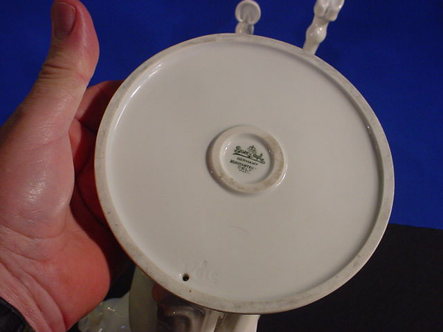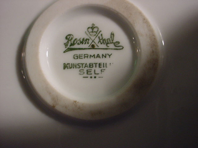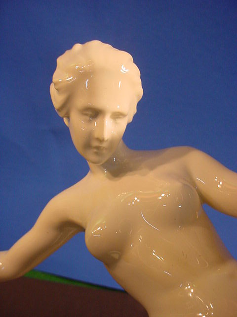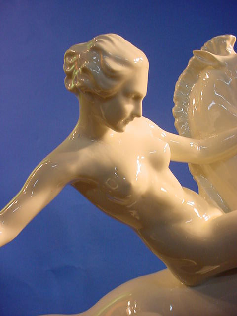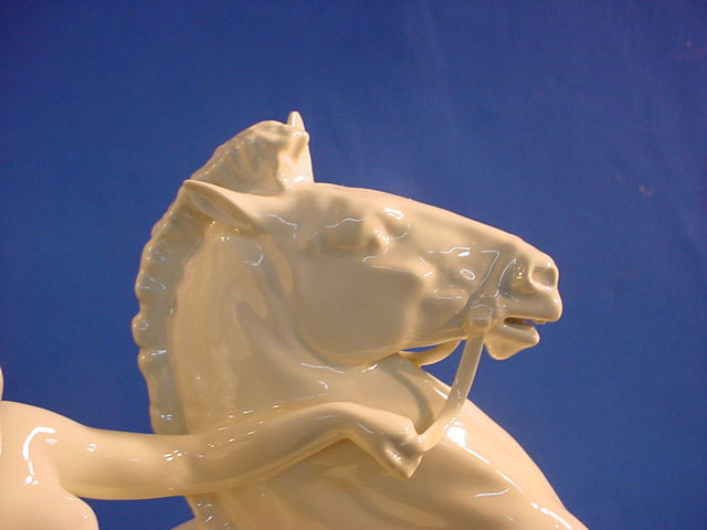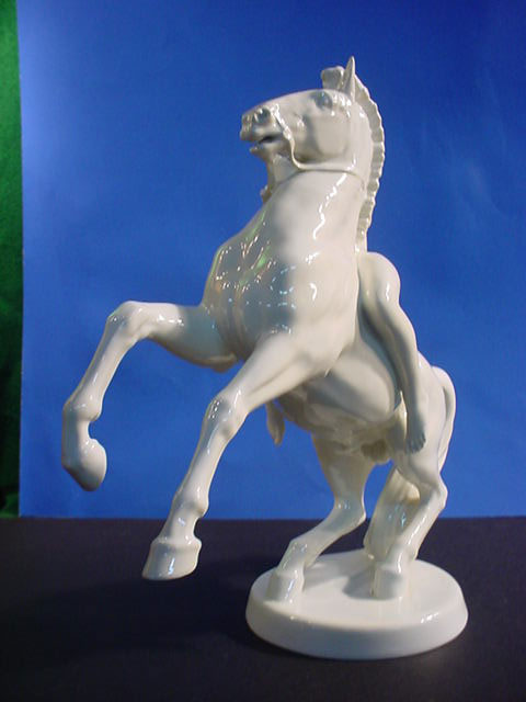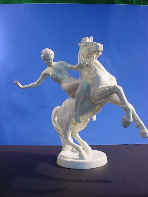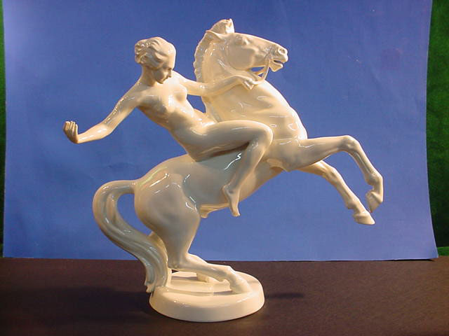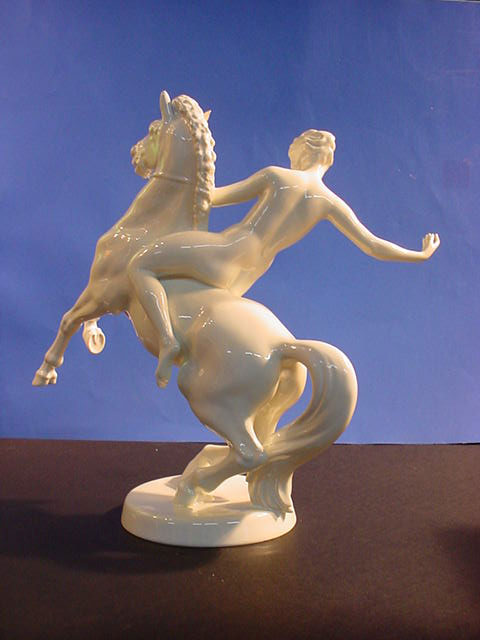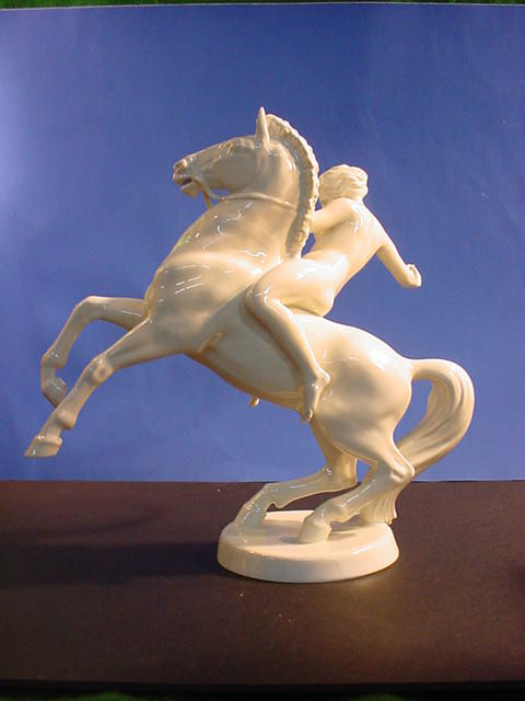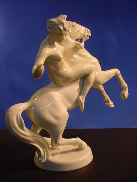 | DESCRIPTION: We don’t know for sure but usually Walkuries, daughters of the Norse God Wotan, wore armor rather than riding in the nude. We lean towards Amazon in this case. But then it could be any depiction of a mortal or Goddess who was an equestrian. Rider in Germanic saga The sculpture is in white hard paste porcelain and signed by the famous firm of Rosenthal in Selb, Bavaria. The piece is alleged to be by Professor Theodore Karner of Munich. He did an Amazon for the SS Allach porcelain firm at one time. It had similarities but the Allach lady had a helmet and sword. Unfortunately, the one we offer is not artist signed. The mark on the bottom is the usual Rosenthal signature with the Bavarian crown above and crossed sticks .Below these sticks there is a very noticeable (dot). These dots will indicate year of manufacture. Since about 60% of Rosenthal’s products were produced for export they used the designation (Germany) rather than Deutschland and you can see this is no exception. The word (Selb) indicates the town where it was manufactured. Between Germany and Selb is the word Kuntsabteilung, this translates to (art department) and in this case this was a special section devoted to figural arts rather than dishes, bowls, etc. Here also were the experimental molds where the sculptures of various artists were shaped and often, only one or two were prepared, especially if some collector ordered a ‘special” edition for himself. Dr.Paul Goebbels for instance, was often known to do this. If you go to SS 7-4 on our pages you can see a piece specially made for Goebbels by Meissen, where you may be astounded by the price So, here we offer you a piece that is no doubt also a ‘special item’ but we do not know who might have ordered it. However, in our best estimation and due to our research we think that this porcelain figure was from the period 1935 due to the large dot and two dots under “Selb”. It appears that Kunstabteilung was discontinued in 1945 according to the Rosenthal book by Dieter Struss. So we feel strongly (almost positively) that this is a Third Reich Era Rosenthal production and most lovely ones by Prof. Karner. In any case, she is a beautiful lady on a gorgeous steed. There is a tiny imperfection on the base that we cannot account for. It looks like a tiny bit of porcelain is marred. But in practically no way does it detract from the overall awe inspiring look of this masterpiece of the porcelain art. It measures 13 inches from the bottom of the base to the top of her head and about 14 inches from the bottom of the base to the top of the animals head. From the curve of his tail to the foremost extended hoof the measurement is 15 inches. So, here ladies and gentlemen ( Germanophiles all!) is an opportunity to acquire a Great art piece. Art in the true sense of the word . Third Reich Art! PRICE: SOLD |