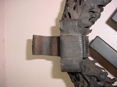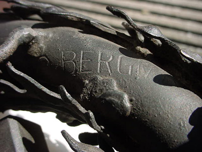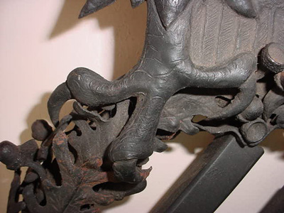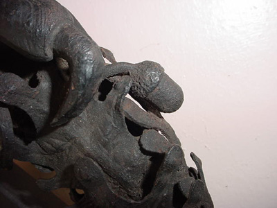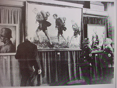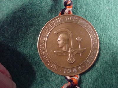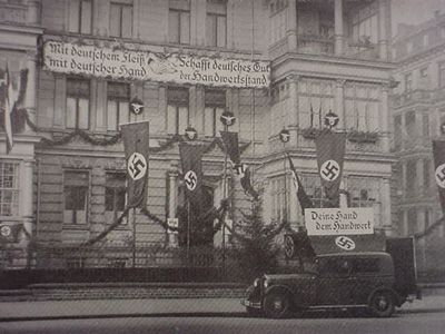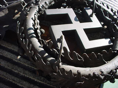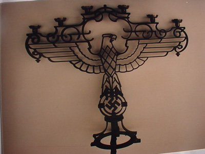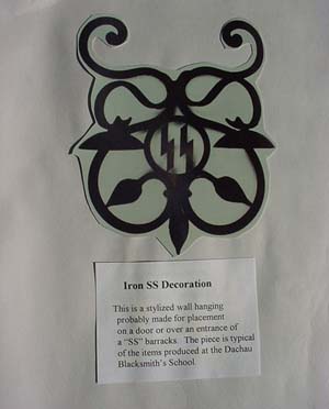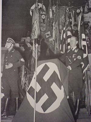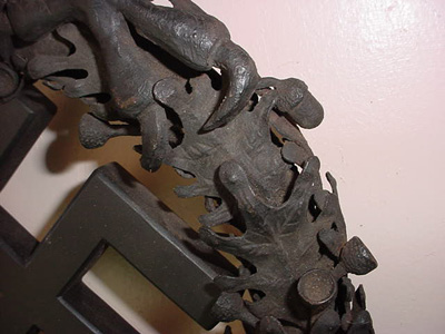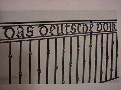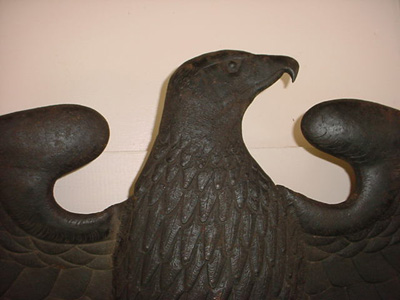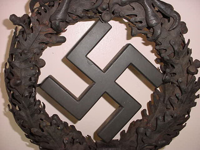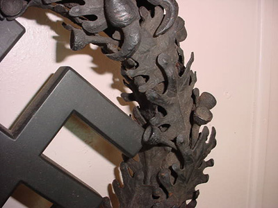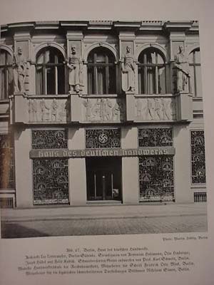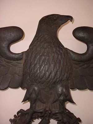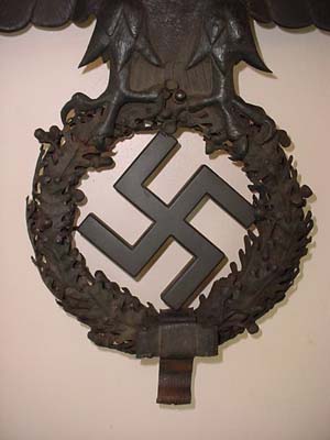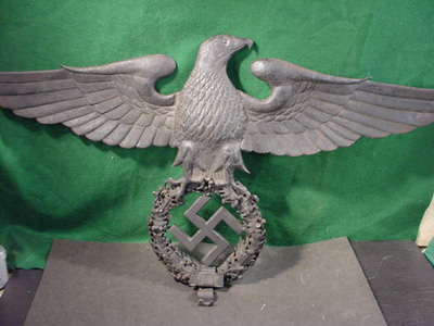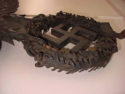 | DESCRIPTION: Tremendous!!!   We now present what we feel is the absolutely greatest   find in National Socialist inspired   art to date.  This   iron crafted eagle is possibly one of the greatest pieces of German   metal work art ever produced in the Third Reich. We have period books showing   examples of such masterpieces but none are as fine as this one yet.   This piece shows artistic mastery throughout, and we are sure it is   entirely unique. It’s possible the eventual purpose was to hang   in someone of the the official office's of the NSDAP, SA or SS eventually,   but it also enjoys the fact that because of its artistic significance   and consequence to the mythos of the Party and the fame of the artists   involved, it was included  in the collection and probably displayed at   the Der Haus der Deutschen   Kunst (House of German Art)    in Munich. There is attached to it a special bronze tag that shows that   this ironwork eagle was from this veritable treasure house of true realistic   art  (at that time!). Unfortunately today at that museum designed   by Prof. Paul Troost one can expect to see the ultra modern art garbage   that was referred to as “Entartete Kunst” (degenerate art).in   the Third Reich. This was the trash that Hitler   called a breeding ground of ‘cultural Bolshevism,’ “Political    and cultural anarchy” on canvas and statuary. In other words some   of the “dreck”  produced by Picasso, Beckman, Kirchner and Grosz.   After the assention of the NSDAP these ugly manifestations of filth   and degeneracy were taken all through Germany to be displayed.with the   purpose of comparison with true Aryan art. It was shown alongside   the first annual ‘Great German Art Exhibition of National Socialist.'   Inspired and approved art that was thoroughly traditional in concept   and technique. Wonderful canvases showing Nordic humanity, heroism,   and the glory of the Aryan race. Bronze statues by Professor Thorak,   Arno Brecker and other famed  sculptors. were revealed to an adoring   German public.  There was an important wing in the museum and in the   traveling exhibition that included the ornamental and culturally important   themes that were created in iron.   ‘Iron’ the very word ‘Eisen’ in German invokes deep significance in the German psyche. Iron Cross, Iron Chancellor, Iron Time, songs, and poems are brought to mind at the mention of the word. More than in any other nation Iron was revered and considered sacred in the sagas of the Teutonic peoples, and the artistic pursuits while working with this sacred metal, in jewelry, sculpture, architectural offerings were almost exclusively ‘Germanic’. A great patriotic song is heard wherever True Teutons would gather ‘Der Gott Der Eisen Wachsen Liess. (The God who let Iron grow!) And it goes on to say that this God will tolerate no slaves. This song by Ernst Moritz Arndt personifies the patriotic fervor incited by even the thought of Iron. So with this said perhaps we can get a grasp on the importance of this manifestation of the iron craft. The piece is doubly significant in that it is not only a great artistic achievement but it also depicts the national symbol embodied in the earliest form of the N.S eagle. This was the eagle of the ‘Kampfzeit’ the turbulent time of the struggle for power by the NSDAP. We believe it was meant in this form to commemorate that early time but also to be a reminder of the fallen of the movement to Red Front and Reaction to quote the main stanza from the “Horst Wessel anthem” DieFahne Hoch (Raise the Banner). The eagle is fashioned from various separate pieces of strip iron all welded together in the finished master work. The two artists who produced it were surely quite noted in this style of iron work. They belonged to the N.S. group known as the German handworkers organization Deutscher Handwerkers Verein (DHV). This was a very important functionary organization that was a great and respected branch of the National Socialist program of cultural achievement and education. The group was a section of the parent organization known as the DAF, Deutsches Arbeits Front headed by Dr, Robert Ley who said in a early speech and we quote “ The duty of the labor service Arbeitsdienst would inculcate in the German people the realization that manual work was anything but disgraceful, in fact labor actually ennobles our people so the NS government did everything to encourage the propagation of skilled workers and especially gifted artists who produced hand wrought artistic items and such items that glorified the mission and agenda of the Third Reich were especially valued! In our attached images is a rare picture of the main office of the DHV and pictures of the NS officials that headed this organization. The two artists who produced this Iron national eagle were certainly such skilled artisans ‘The tip of the eagles wing at the back is signed K. Hufnagel and in the wreath it is signed Bergmann. The eagle is huge! Measuring 47 inches from wing tip to wing tip the measurement from the top of the eagles head to the bottom of the scroll that is part of the wreath is 23 inches the work that was all done by hand is really astounding, every one of the chest and wing feathers are detailed to the full extent. The wreath is wonderfully incredible with every single oak leaf worked, affixed and engraved by these artists. We hope with our pictures that   we are able to help you to perceive the absolute artistic genius that   went into this effort. The acorns are completely realistic with some   closed and others with their tops open just as they would be in nature.   The swastika is cut from one thick sheet of metal and is bold and ultimately   dramatic.  The eagles  claws are lethal looking and beautifully   depicted.  This artistic achievement   is probably the most important piece historically and the most beautiful   we have ever acquired or even seen.  PRICE: SO