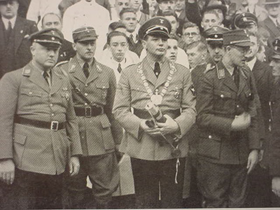 DESCRIPTION: Hans-Adolf Prutzmann -31 Aug 1901-21 May 1945 was a superior SS and police leader. As an SS Obergruppenfuhrer. He was the senior N.S. official administrator of Latvia. After completing his studies at the Gymnasium, Prutzmann studied agriculture, before he became a member of various Freikorps between 1918 and 1921. Despite being a member, he nevertheless avoided military and typical Freikorps-related aggressive situations. This however, changed in 1923, when he interrupted his studies to accompany a Freikorps involved in the Upper Silesian uprising. Afterwards he worked for seven years as an agricultural official in Pomerania, Brandenburg, and East Prussia. He joined the SA in 1929. Since Prutzmann had become quite a radical soldier as a result of his Freikorps experiences, and since his own personal goals did not match the clearly milder thinking found in the SA, he left the organization in 1930 and transferred in the same year to the SS. At the same time, he was admitted to the Nazi Party. As of this point in time, Prutzmann’s career began a steep rise. While functioning as a Member of the Reichstag, he was appointed SS Brigadefuhrer in November 1933, and in February 1934 he was given the rank of SS Gruppenfuhrer. At the same time, Prutzmann was appointed leader of the SS Upper Division Southwest in Stuttgart. From March 1937 until May 1941, Prutzmann led the SS Upper Division Northeast whose headquarters were in Konigsberg (now Kaliningrad). By April 1941, Prutzmann had been appointed Generalleutnant (Lieutenant General) of the Police. From June until October 1941, he was Hoherer S.S. und Polizeifuhrer (Higher SS and Police Leader) of Russia-North, the post being responsible for internal security and combating the murderous red partisans. He held the same position in the Ukraine and Russia-South until the summer of 1944. He also commanded Kampfgruppe “Prutzmann” in the Ukraine during the early summer of 1944, and was awarded with the German Cross in Gold for his action. From June to November, 1941 Prutzmann held the post of higher SS and Police Leader. Hoherer SS und Polizeifuhrer or HSSPF for Latvia; effectively this made him ruler or with Hinrich Lahse, co-ruler of Latvia. His office was moved to the Latvian office of the S.S. Sicherheitsdienst or security service as HSSPF Latvia. Prutzmann was in charge of the SD. It is known that Prutzmann was responsible for removing the Jews of Latvia into Ghettos. One of his last promotions came in September 1944 when Prutzmann was appointed by Heinrich Himmmer as Generalispekteur fur Spezialabwehr (General Inspector of Special Defense) and assigned the task of setting up the Werewolf force’s headquarters in Berlin and organizing and instructing the force. The Werewolves were volunteers that should have formed a nucleolus of resistance fighters. Prutzmann had studied the guerrilla tactics used by Russian partisans while stationed in the occupied territories of Ukraine and the idea was to teach these tactics to the member of Operation Werewolf. As originally conceived, the Werewolf units were intended to be legitimate uniformed military formations trained to engage in clandestine operations behind enemy lines in the same manner as Allied Special Forces such as Commandos. In early 1945, under orders from Himmler, he directed the assassination of the Allied-appointed mayor of Aachen, Franz Oppenhoff. Shortly before the war ended, Prutzman was captured by the Allies and became a prisoner of war. While in their custody, he ended his own life. Whether his suicide happened in Luneburg, or as another account has it, at an interrogation came at Diest in Belgium is not quite clear, but it seems certain that his date of death was 21 May 1945.  Dates of Ranks Earned: Notable Decorations: This was the career of one of the highest placed SS officers of the 3rd Reich. A German tragedy while he lived, he actually lived the words of the song - - - Wenn alle untreue werden so bleiben wir doch Treue ! The box or chest made of Prussian amber was presented to SS Gruppenfuhrer and N.S Senator Prutzmann by none other than the Gauleiter and Reichstatthalter Karl Kaufmann who was also famous in his own right. A Reichstatthalter is a Governor and Gauleiter would be the supreme Party Leader of a regional branch of the NSDAP (made up of many such districts.) Karl-Kaufmann (20 October 1900 – Dec 4 1969) was the NS Gauleiter in Hamburg. He was born in Krefeld. He served as a war volunteer in WWI and in the Freikorp’s Brigade Ehrhardt 1919-1920. He was a founding member of the NSDAP in 1921. He quickly became one of Adolf Hitler’s favorites. He was appointed Gauleiter of the Gau’s Rhineland and Ruhr in 1922-29, he then was appointed Gauleiter of Hamburg in 1929, a post that he would hold until 1945. He was also a member of the German Reichstag. After Hitler gained power on 16 May 1933 Kaufmann was appointed Reichstattthalter (Regional Governor of Hamburg with absolute power over 1.8 million people. One of his past accomplishments was to turn over control of the city’s Fuhlsbuttel Prison to the SA and SS where it became the nucleus of the Kila-fu concentration camp. Adolf Hitler declared Hamburg a fortress, similar to Festung Warshau. The cities of Posen or Kolberg. In April 1945, Kaufman wanted to capitulate without further struggle. After negotiations and the publication of a pamphlet that Kaufmann prepared, suddenly (without Kaufmanns consent) - Hamburg was declared an open city by Admiral Karl Donitz. We mention this because it is ironic that Prutzman and Kaufmann were close associates and friends (This will be borne out when we describe the box.) The amazing thing was that due to Kaufmann’s attempts at the Hitler forbidden capitulation he could possibly have been on Prutzmann's hit list kept by the short lived Werewolf units. He could have ended up like Franz Oppenhof the Mayor of Aachen who was assassinated by the order of SS Obergruppenf