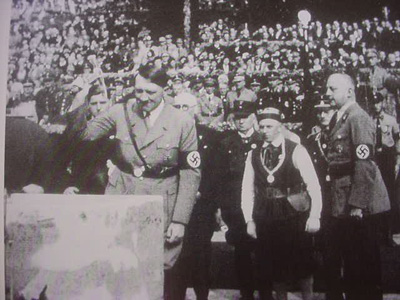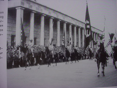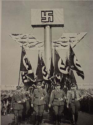 he said, "As long as the enemy defies us upon German soil, hatred is our law and our one duty revenge!" That statement echoed down through the ages and the SS and SA men of the NSDAP truly took it to heart and when the German army marched into the Rhineland in March 1936 the   French occupation Senegalese Negro troops were fleeing in horror before the swastika banner.  The German soldiers were singing “Als Die Romer Frech Geworden” also known as the Hermannsleid. The transition of the song's title is "When the Romans became cheeky!"