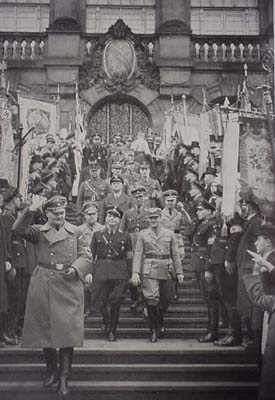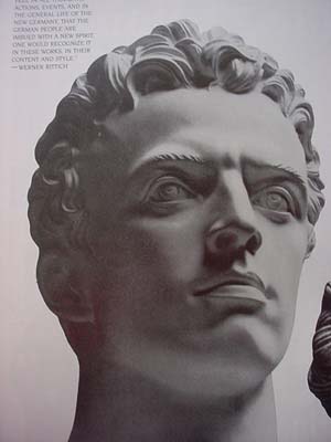 DESCRIPTION: Translated this means Munich the Art City of the New Reich. It contains 113 pages in a soft cover version measuring 9" x 12". The pages display scenes from Wagner’s operas, statuary, paintings, architecture of the old and the NS era. Several pages of Munich ads, etc. etc. This is really a beautiful volume just filled with the arts associated with this the “Hauptstadt der Bewegung” (Head city of the Movement-- by the way -- “My favorite city”). Some great color pages and spectacular clear black and white photos throughout. PRICE: SOLD  |
