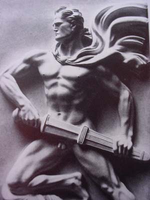DESCRIPTION: This marvelous statue measuring     13 ½ inches high with a base 4 ½ inches square (length and   depth) personifies the strength and determination of the “Deutscher   Soldat” from the time of the battle of the Teutoberg Forest up through   the pages of history and into the 2nd World War. The   slogan that might go with this wonderful sculpture could be “Die Ganze Welt Gegen Uns”! The whole world against us!   Yes, Germany in the embodiment of the Heilege   Vaterland was always to protect Europe against the constant   incursions   from the east against the Magyars, Huns ,Goths, and Visagoths and even   the moribund Roman Empire. The land of Germania and its Teutonic Volk   took on all comers. It was no different in the   2nd World War when Germany with a few allies stood against   the Maelstrom in what was a German led crusade to destroy the   beast of Bolshevism before all of Europe was disseminated by what   President Regan later called the Evil Empire. Tthis was truly “evil   personified! “ And in this author's perception, all the nations who   joined in the fight to preserve communism and crush Germany were the acolytes of   Stalin and Tito and obviously Satan*. (*Authors historic opinion.) The statue you see here tells   of a saga that we have briefly touched upon in the forgoing narrative. As this Warrior stands naked   before the world, the artist who sculpted him conveys in statuary the   defeated yet proud and militant German soldier who wears the Stalhelm   (steel helmet) and makes ready the sword of Siegfried known as  Nothung for the next time the call of the besieged   Fatherland   is heard. We readily admit that all of   this will only be understood and honored by Germanophiles, but  we can envision all the deep meaning that this artistic   masterpiece   conveys. Nothing else that we have ever   offered or seen offered comes up to the artistic expression and   important   significance of this prodigiously important piece. Its historical importance is   magnificently conveyed. This statue which may actually   be unique; it is a presentation piece to an officer who was   “Beirat” (military advisor) to the Third Ulan battalion in Berlin.   This wonderful gift was from the Kameradschaft (comrades)   and presented to him for his true service to the Batt. From 1920 to   1940 this illustrious unit was the Third Guard Uhlan regiment and in   WW 2 the Uhlans became armored divisions and covered themselves with   glory in the early campaigns in Poland and the military engagements   against France and Russia. The sculpture weighs about   14 pounds with the marble plinth and is in perfect condition with a   gorgeous patina throughout. Deutschland Uber   Alles !   PRICE: SOLD  |