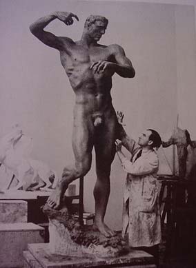 | DESCRIPTION: Here is what I would have to say is the sculpture that is my favorite of all the magnificent bronzes that we have ever acquired or owned in our personal collection. The subject is known as “Vae Victus” by famed sculptor Henri Désiré Gauquié (1858-1927). Born in the ancient French village of Flers-lez Lille, Henri Gauquié is well known for producing a number of small bronze statues and a large number of life-size monuments of people and animals in France. One of his famous horse sculptures is the equestrian statue of Marshal de Villens in Denain, a town between Lille and Valenciennes. It commemorates the Marshal’s victory at the Battle of Denain on 24 July 1712. A well-known monument to the French Baroque painter Jean-Antoine Watteau was created by him in 1896 in the Jardin du Luxembourg in Paris as collaboration in marble and bronze with the architect Henri Gillaume. Henri Gauquié died in Paris in 1929. He was certainly one of the finest and greatest sculptors that France ever produced and it was certainly the nation of sculptors. The Sculpture The depiction here by Gauquié is of a warrior of the Teutonic tribe known as the Cherusci, which, under the brilliant leadership of the chieftain Arminius, or Hermann, ambushed and decisively annihilated three Roman legions and auxiliaries which were led by Publius Quinctilius Varus. Varus was a noble from a patrician family which was related to the Imperial family. Varus’ name and deeds were well known beyond the Roman Empire because of his ruthlessness and crucifixion of insurgents. While he was feared by the people he was highly respected by the Roman Senate. On the Rhine he was in command of the XVII, XVIII, and XIX Legions. The great and bloody battle ensued after Varus attempted to enter and raid the Germania territory east of the Rhine River. After the tremendous loss during the Schlacht im Teutoburger Wald, the Battle of the Teutoburg Forest, the Roman Legions never again attempted to conquer the people in the east of the Rhine. Arminius was the son of the Cheruscan chief Segimerus and trained as a Roman military commander. He had lived in Rome as a hostage in his youth where he received a military education and obtained Roman citizenship and the status of equestrian knight before returning to Germania and defeating the Romans and after seeing to the unity of the Germanic tribes and to thwart Roman efforts to incorporate the German lands into the Empire. Then, in the year 9 AD, the Romans fell into a trap and ambush set by this ex-soldier of Rome who was still loyal to his original people. Twenty thousand of Rome’s finest soldiers were totally annihilated. Their commander, Varus, committed suicide by falling on his sword. Arminius’ success in destroying three crack legions and driving the Romans out of Germany was the single most devastating defeat that Rome had ever suffered in its history and was a high point of Germanic power for centuries. Roman attempts to reconquer Germany failed in every instance. The sculpture is magnificent. I have always been an ardent admirer of the sculptor Arno Brecker and Josef Thorak who were the official sculptors of the Third Reich. Thorak always created grandiose monuments and statues intended to represent the folk life of Germany that was under the NSDAP government. These works tended to be heroic in scale up to 65 feet in height. His official works from this period included a number of sculptures erected at the Berlin Olympic Stadium of 1936. His preference was for heroic statuary of Aryan man in the neoclassical nude and seminude depictions that practically portrayed these Aryan heroes as gods upon the earth. Certainly, this was the elite of the races of man. Perhaps it is because of my love of the art of Thorak and Brecker that I am transfixed and awed by this sculpture by Gauquié because I have never seen any bronze work of art that is so reminiscent of the work of those two German masters. The style is exactly the same right to the Aryan features and general physiognomy. The Teutonic warrior triumphantly holds high the captured Roman sword (gladius) as he treads into the forest floor. At his feet is the broken Roman-eagle standard with the letters “SPQR” the meaning of which in Latin is “The Senate and People of Rome” “Senatus Populus que Romanus.” Also thrust to the ground under the Teutonic feet is a plaque with the effigy of Emperor Augustus, who was so shaken by the news of the battle’s result that he stood butting his head against the walls of his palace repeating “Quintili Vare, legiones redde!,” “Quintilius Varus, give me back my legions!” This is a very large bronze. It measures 40 inches from the bottom of the base to the hand holding the sword. The measurement from the bottom of the base to the top of the warriors head is 36 inches. This statue summons all the utter ferocity of one of the world’s greatest and most prodigiously important battles that essentially stopped the moribund Roman empire from its eastward expansion and I think it shows the mettle of the German fighting men who many centuries later would be recognized in the German WWII Wehrmacht as we now know them. This statue can be a tribute to bravery and the constant struggle for freedom for western man. PRICE: SOLD  |