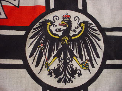 DESCRIPTION: This is a very beautiful veterans’ standard from Barkelsbv v. Umgegend which is probably a small town but the veteran that owned it was a sponsor of the regiment named after Prince Heinrich of Prussia. Heinrich was Kaiser Wilhelm’s brother and it surely must have been an illustrious regiment to bear a name such as this. It was the elite regiments that bore the names of the royals. The obverse side has the Prussian eagle as its central theme and in the corners are the battle honors of the regiment. Its accomplishments at that point date from the Franco-Prussian War. It depicts victories at Orleans, Paris, Sedan, and Metz. All these battles mentioned bring forth memories to the military historian of deed victorious and battle glorious and of course this is why these standards were of such importance to the regiment’s veterans and they rallied around them at every reunion and warrior-day parade. When not before marching vets the standards hung in a place of honor in the veterans’ hall. This flag measures 53 x 46 inches and of course it shows some fraying after close to 100 years of the constant rugged use in the ceremonies of gallantry that were constantly a part of Germanic military heritage. The workmanship is superb and typical of the labors of love demonstrated by the ladies of the Verein who undertook the difficult task of making these standards by hand. The reverse of the piece shows the figure of “Germania” (is that why we think so much of it?). She, of course, is the spirit of the German lands as she stands along the Rhine with the uplifted Prussian crown. She also clutches the sword of the Germanic empire; oak leaves surround her symbolizing the strength of the mighty oak! Above her is a scroll with the words: “Gehorsam, Treue, Tapferkeit,” “Obedience, Loyalty, Courage.” Underneath is says: “Des Deutschen Kriegers Ehrenkleid,” “The German fighters’ honorable cloak.” Germania has the Prussian eagle embroidered on her bosom and she sits on the lion-motif throne. This is a rare piece of Teutonic splendor from a better age; an age of Imperial glory, a refined age, an age of cultural excellence, an age personified by this visage of GERMANIA.