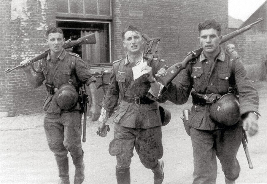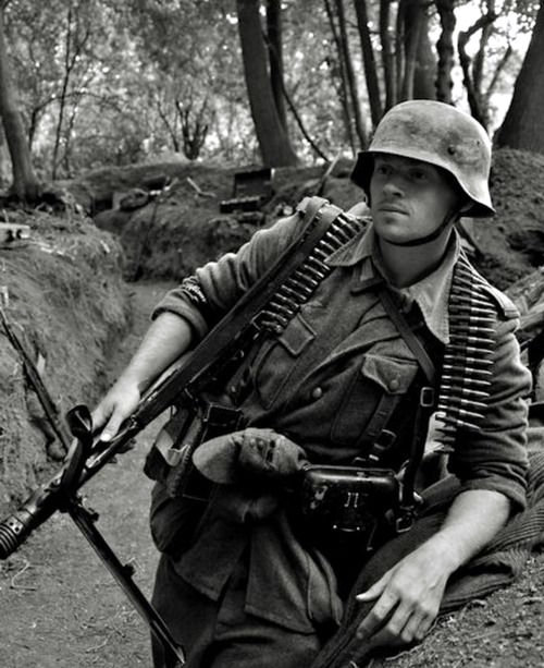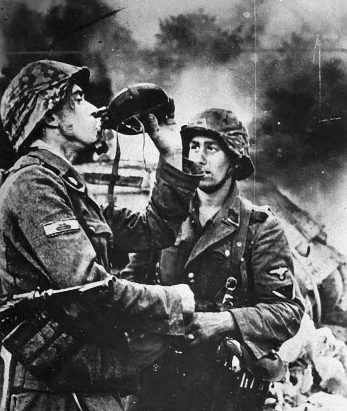 DESCRIPTION: This poster was part of a collection that came out of Russian archives. The German poster depicts a group of frontline soldiers on the combative advance. The central figure wears the Knight’s Cross of the Iron Cross and a tank destroyer patch. He holds at the ready an MP-40 submachine gun. In large letters across the bottom it says “Infanterie, Königin Aller Waffen” (Infantry, Queen in all Battles). This is possibly the most dramatic WWII poster ever produced; the colors used are beautiful. The poster is in excellent-plus condition except for the fact that it had been folded over in the archives; however, if placed in a museum frame with special glass this would not be noticed. It is a very fine line. The poster measures 34 by 22¾ inches.