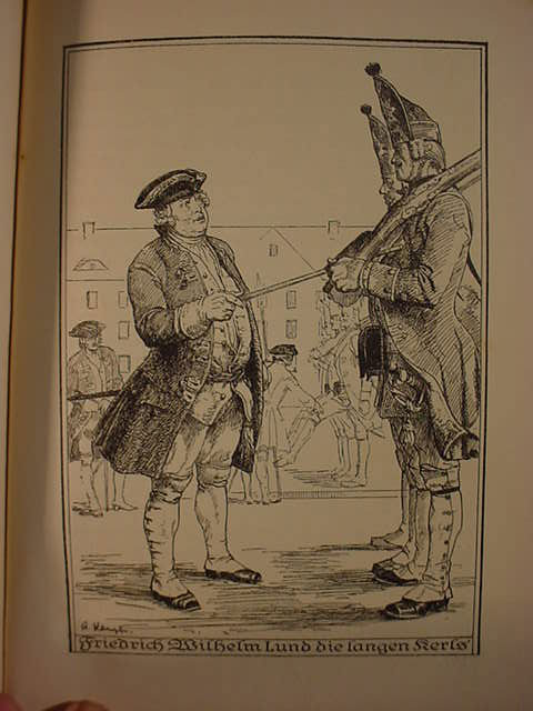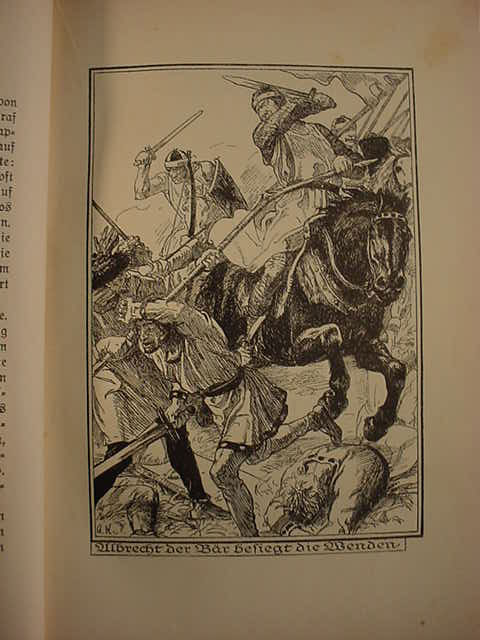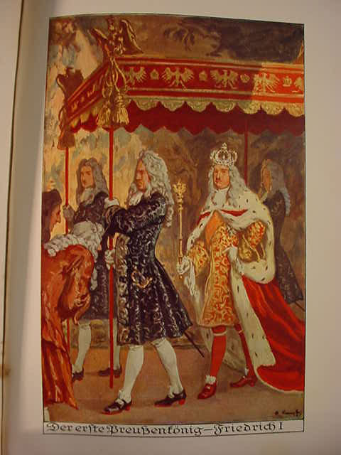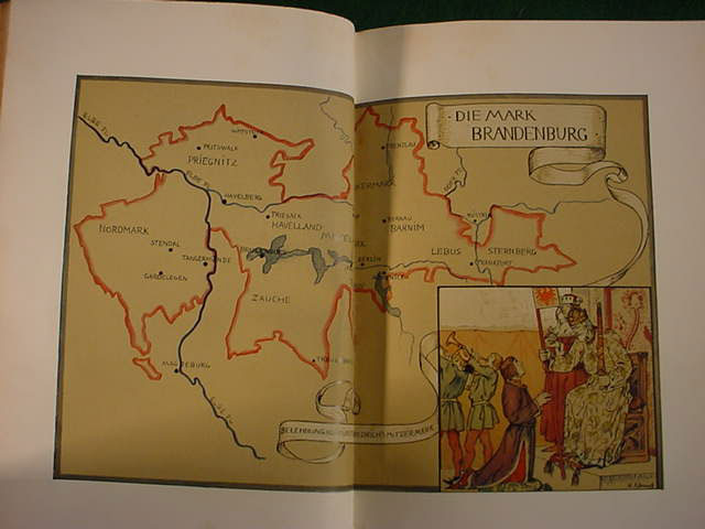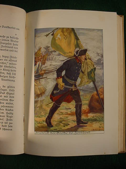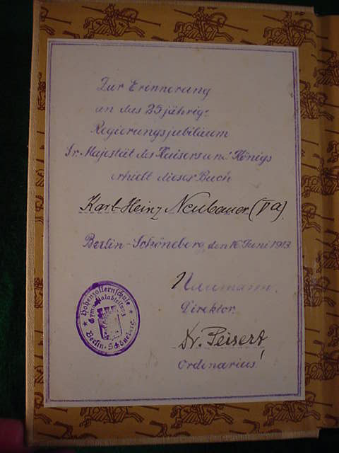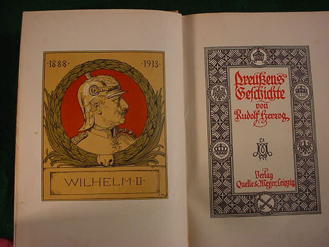 DESCRIPTION: This is a beautiful little book by Von Rudolf Herzog called Preusens Geschich, the history of the German state of Prussia. 377 pages with many black and white illustrations and full color pictures. The book has a glued in presentation inside the front cover that says it is presented for the 25 Year Jubilee of the rule of our Kaiser and Konig (King). This book is dedicated and the signature of KarlHeinzNeubauer who was the director of the Hohenzollern School in Berlin Schöneberg Branch appears in the inside cover .The book also has a N.S. Party property tag in its fly leaf. This is found in books that were donated to the Nazi Book Fund, a section of the Winter Help Work. This was a group that was part of Hitler’s four year plan to assist the poor in the early years of the party’s progress. Measures 6 in x 8 ½ in. All the way from the time of “Albrecht der Bar” (Bar = Bear) right along to Kaiser Wilhelm II. Few color pictures but the 10 or so are brilliant and stunning especially the one of Fredrich The Great leading his troops personally into battle at Zorndorf and the one of Kaiser Wilhelm I entering Berlin after his defeat of the French in 1871. The jubilant crowds greet their warrior King. A beautiful important little book for the true Germanophile Fabulous cover too! !