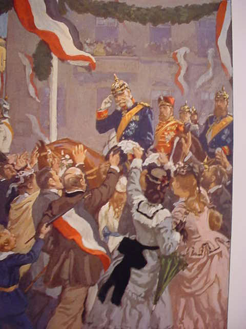 DESCRIPTION: This large painting measurers 39 x 27 inches, but with frame it is 44 x 32 inches. It is by Carl Rochling, who is listed in Davenport’s book listing known artists. Carl Rochling is listed as living 1855-1920. He is listed as a specialist in German soldiers with at least one listed as ‘SOLD’ at $2,500. This was a canvas 40 x 73 inches. This was undoubtedly a long time ago. Rochling was quite a famous artist in Germany. One of his most famous paintings was “Germans to the Front,” a scene from the Africa campaigns. His most famous painting was “Frederick the Great” at the Battle of his Zorndorf. This one was shown in many books and would be impossible to estimate the value today (do I hear priceless?). Remember, this is an original artwork by a major artist. It seems that Rochling particularly liked to illustrate the war in German East Africa during World War I. His famous painting “Germans to the Front” has pith-helmet-wearing soldiers storming up from a landing craft somewhere in the British-versus-German action. Emerging from all this struggle is the famed “Lion of Africa,” Paul von Lettow-Vorbeck. The painting, we offer is also reminiscent of the Africa campaigns from the look of the scenery that the soldiers trod through. Carl Rochling was born in Glogau near Saarbruck on 11 October 1855, and died in Berlin on 6 May 1920. He was perhaps one of the most prolific military artists of the late 19th century in Germany. In 1880 he studied under the great German historical artist Anton von Werner, where he quickly developed an interest in military subjects. The events of the Franco-Prussian War were particularly appealing to the young artist and he later produced many scenes of victorious passions in battle such as an episode in the Battle of Wissembourg and the capture of the chateau at Grisberg. Many of his pictures were used to illustrate regimental histories of the various Prussian units involved in the 1870 Franco-Prussian War. We have shown some of the other great works of this great master artist of Germanic soldiery. His name and his works will live in history, and here's a chance to actually own an original painting by this, one of the greatest German artists of all time.