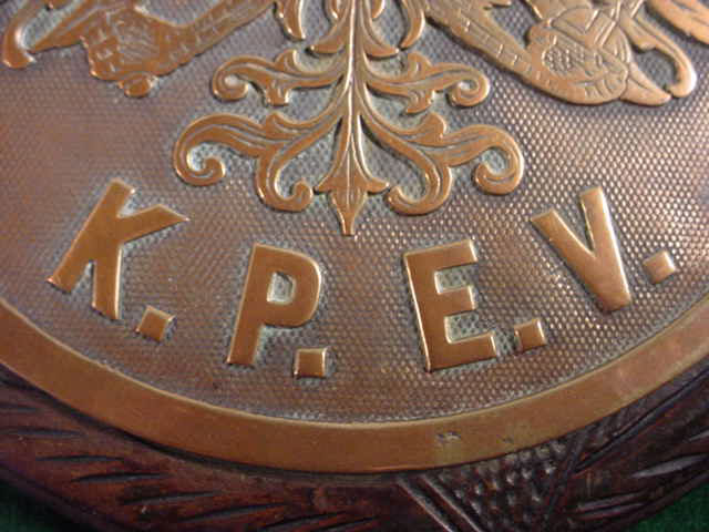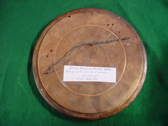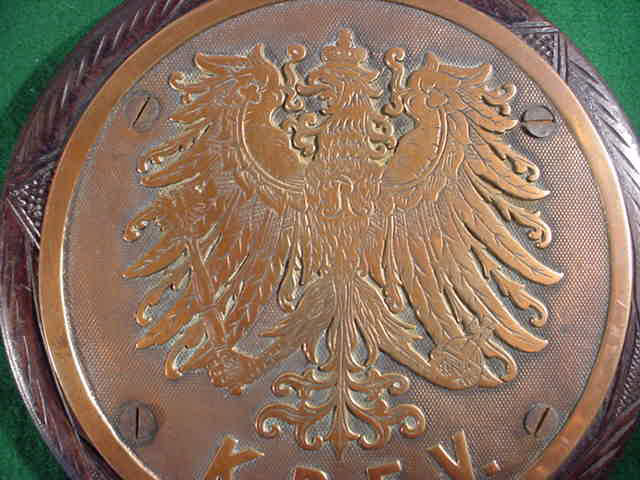 DESCRIPTION:This is a beautiful brass plaque that probably was affixed to various buildings and RR stations during the Kaiser Reich. It measures 9 ¾ in diameter and weighs without its wooden display board at least 3 pounds. It features a large HohenZollern Eagle mounted on a piece of wood added later for display purposes. Four screws are seen in the face of the plaque; this was for secure mounting. This is for the Koenigliches Prussian Eisenbahn Verwaltung (or the Kaiser’s Prussian Railroad Administration.) This sign demonstrated that this was an official German government installation. An eagle of the same type from the same organization is featured on the site of the Rittmeister Militaria LLC. Updated 11 July 2008. They are asking $1,100.00 for theirs.