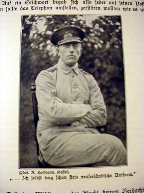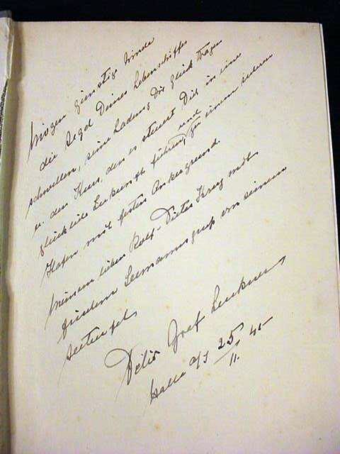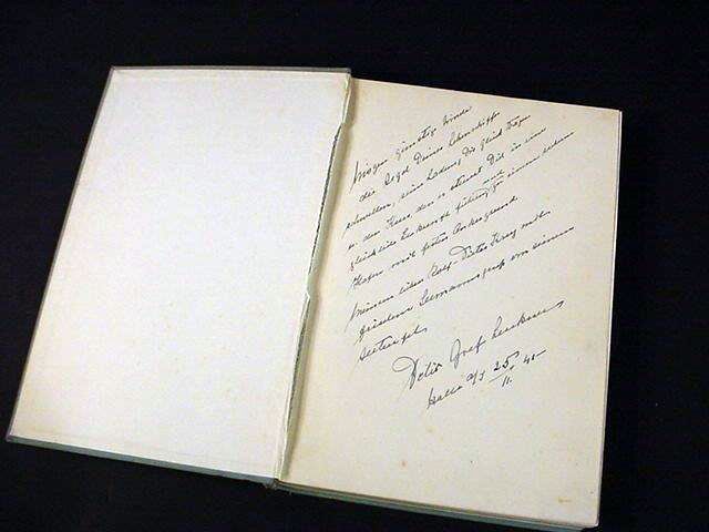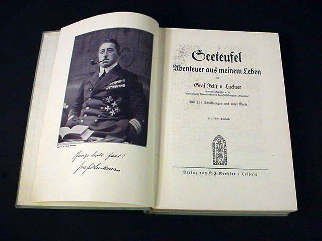 DESCRIPTION: Here signed and dedicated is the book by the famed and celebrated “Sea Devil” Count Felix Graf von Luckner. We have given a capsule review of the life and fantastic career in the description of the photo above. He was a man’s man and a hero beyond any normal human concept. As a much-adored Teutonic warrior of the sea, the epithets “Sea Devil” and “Kaisers’ Pirate” he bore proudly as he faithfully and dutifully served his Deutsches Vaterland. His very countenance as he puffed on his ever-present pipe gave off an aura of not only self-confidence, but that look that seems to portray the demeanor of a super swashbuckler personified. He indeed loved the sea and was one of the greatest luminaries of the annals of the sea and those who heard her clarion call ever sounding on her waves. The Book This volume is named Seeteufel (Sea Devil) and has the subtitle Abenteuer aus Meinen Leben (Adventures of My Life). The book measures 9 x 6 inches and comprises 308 pages with 133 crystal-clear photographs of his ship Seeadler (Sea Eagle) and other pictures of his crew, his adventures, and so many, many others. When the cover is opened the dedication and signature is seen there in the count’s own handwriting. He says (translated): “May the good winds fill the sails of your ship of life and the cargo shall bring you luck. The direction it sails should guide you through a happy life and a harbor with good anchorage. To my beloved Rolf Dieter with a happy sailor greeting from the Sea Devil, Felix Graf Luckner. Halle Nov 25, 1940.” It’s signed by Count Luckner. This is a historical treasure, indeed. The book was published in 1921 in Leipzig. It is in remarkably fine condition with a little loosening in the inside cover across from the dedication. It also has the slightest fraying at the very bottom of the spine. This is a tale of high adventure, daring-do, romance, and sheer courage. The chance today of finding not only an original hand signature plus a wonderful dedication like this would be most fortunate for the archivist or collector. The pictures alone are absolutely great! PRICE: $390.00; Most definitely reasonable |