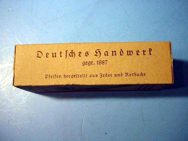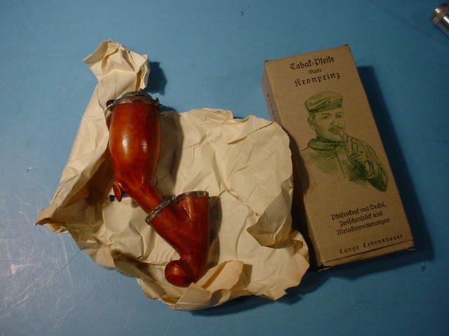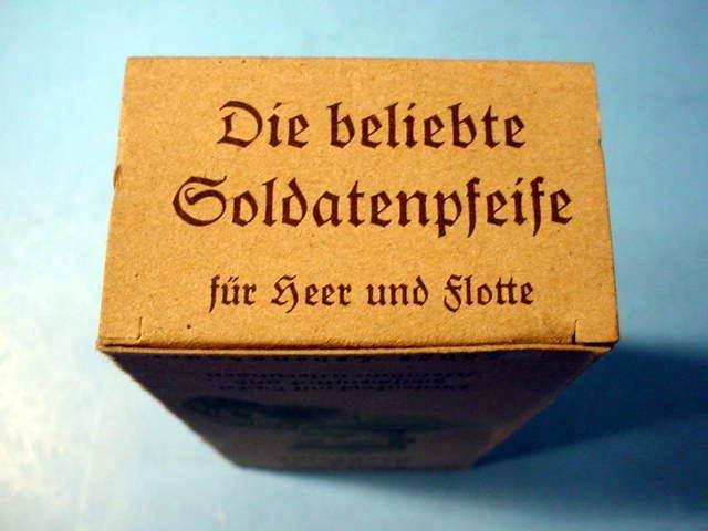 DESCRIPTION: This is a very interesting lot. It’s a typical German pipe as used by generations of German civilians and soldiers. It’s handmade and its box tells us that (Deutsches Handwerk). The company that produced these pipes was founded in 1887. The product has the label Tabak Pfeife Kronprinz, and on one end of the original carton it says (translated) “The favorite soldier’s pipe for army and navy.” The other end has the German national eagle of the Imperial period; it was produced by C.G. Reich Pfeifenfabrik in Thuringen. The pipe in its original carton is comprised of the pipe bowl only, as the soldier receiving it would have his own pipe stem, or so it could be assumed. On one side is an image of the typical German Landser or Soldat, and on the other side, the Prussian Crown Prince.