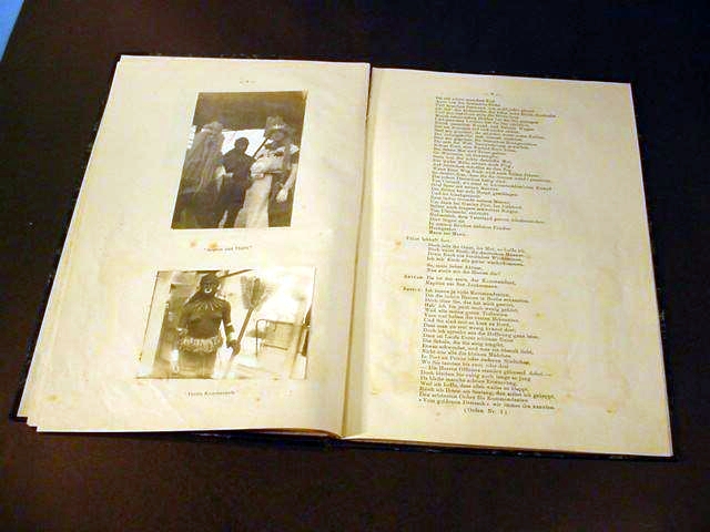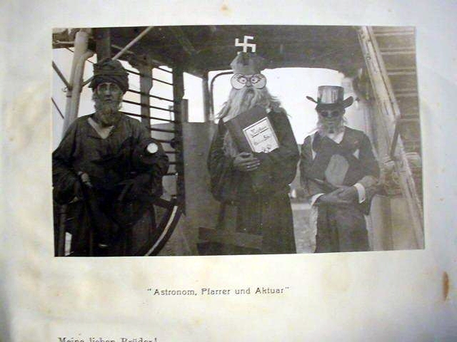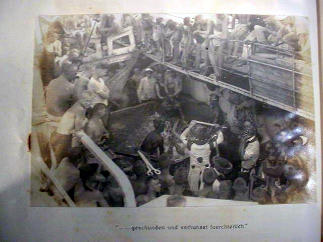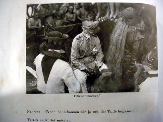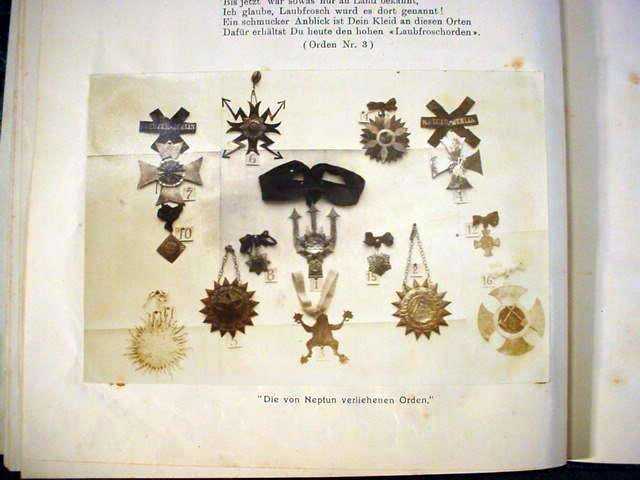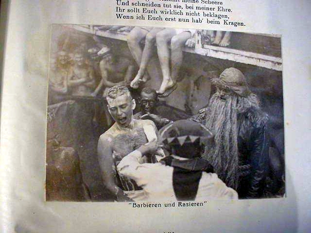 DESCRIPTION: It has long been a custom of many nations’ navies to hold a ceremonial initiation rite to celebrate and commemorate sailors’ first crossing of the equator. These recruits are called ‘Pollywogs.’ The two-day event (evening and day) in which previously indoctrinated crewmembers (Frosty Shellbacks) are organized into the royal court of Neptune to indoctrinate the “slimy pollywogs” into the mysteries of the deep. Physical hardship, in keeping with the spirit of the initiation, is tolerated and each pollywog is expected to endure a standard initiation rite in order to become a Shellback. The event of the equator crossing is called Wog Day, and after crossing the line pollywogs receive subpoenas to appear before Neptune, God of the Sea, and his court and Neptune’s assistant ‘Davy Jones’ and her highness, Amphitrite, who are represented by the highest-ranking seamen who officiate at the ceremony which is often preceded by men dressed up as women afterwards. Some Wogs may be interrogated by King Neptune and his entourage and the use of truth serum (hot sauce and after shave) plus uncooked eggs put in the mouth and numerous other silly indignities and ordeals are experienced by the Wogs. They are even in some cases forced to crawl through shoots of rotting garbage, hair chopping being coated with axel grease, being locked in stocks and pilloried. They might be pelted with mushy fruit, etc. All this for the entertainment of the Shellbacks. Once the ceremony is complete a pollywog receives a certificate declaring his new status. This has been for the most part an almost identical ceremony on ships of all nations (an old naval tradition) and the maritime Germans were no exception. In fact with typical Teutonic tradition they of course had to bring it almost to a science exceeding any other navy in the furthering of the custom. What we have here is a rare book that could be considered a ships log of sorts but it chronicles the Tauf Akten (the baptism of the sea at Neptune’s Court) aboard the famed Kreuzer Berlin (cruiser Berlin). The SS Berlin was a passenger liner of the early twentieth century, which later saw service as an auxiliary cruiser of the Imperial German Navy during the First World War. She was built in 1908 by A.G. Wesen of Bremen for the North German Lloyd Shipping Line and saw service on the Genoa-to-N.Y. route prior to the outbreak of the war. In August 1914, she was taken over by the Kaiser’s navy for service as an auxiliary cruiser. Berlin was one of the more successful of Germany’s raiders accounting for the single most grievous losses to the British Royal Navy’s strength in the early “Klein-Krieg”campaign. After many engagements Berlin sought to return to Germany, but put in to Trondheim with storm damage and really was unfit to leave port and she was interned by the Norwegians on November 18, 1918. She remained in Norway for the duration of the war. There is some confusing information about her eventual destination; some say she was turned over to the British for war reparation. This book proves different because in 1925 the ceremony here took place and all the printed ceremony is chronicled in the German language. The log book is comprised of 20 pages and 10 great pictures of the initiation ceremony that are actually hilarious. This is actually an archival treasure important to the annals of the German Sea Service.