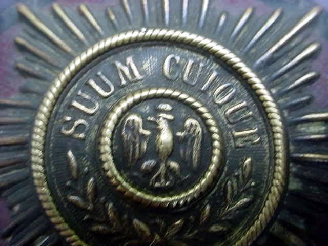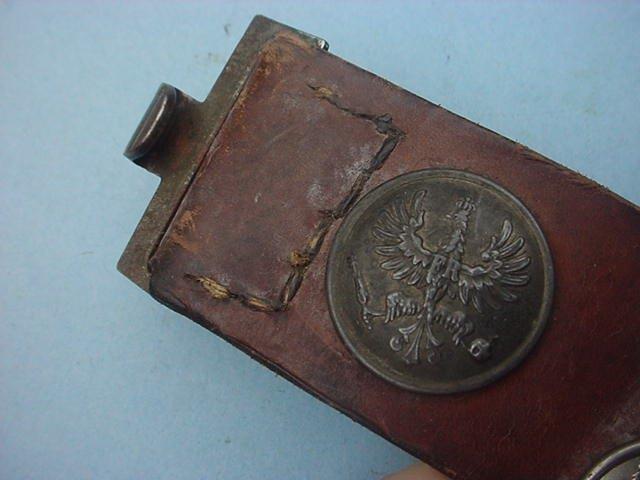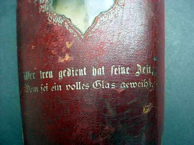 DESCRIPTION: Here is a flask from one of the most elite regiments of the Royal Prussian Army and it was essentially a Guard Grenadier Regiment and an infantry regiment, as well. The tradition of royal guard units dates back to 1626 when Elector George William of Brandenburg had a standing mercenary unit established during the Thirty Years’ War to defend the borders of his margraviate. The First Grenadier Regt. was formed after the Napoleonic Wars of Liberation on 17 October 1814, by order of King Frederick Wilhelm III of Prussia and it was named in honor of Tsar Alexander I of Russia, who was also its first colonel in chief. Parts of the formation had distinguished themselves in the 1807 Siege of Kolberg. Most of its officers had been decorated with the Iron Cross or the order Pour le Mérite. The regiment was elevated to the rank of Royal Guard on 18 February 1820, and was first based near Alexanderplatz in Berlin. About 1900, the garrison moved into larger barracks near Friedrichstrasse station, which later, until 1990, was occupied by the Friedrich Engels Guard Regiment of the East German National People’s Army. The former parade ground today is the site of the Friedrich-Ludwig-Jahn-Sportpark. After WWI, the regiment was demobilized on 27 November 1918, though volunteers were still employed by the Weimar government in the Silesian uprisings and against the Bavarian Soviet Communist Republic. Officially disbanded with effect of 31 December 1920, the remaining forces formed the 9th and 12th company of the Infantry Regiment 9 Potsdam, carrying the Alexander tradition further in the new Reichswehr military organization. The Flask The flask is covered in leather and the guard star and other metal items were applied back in 1897 through 1899, the years that the soldiers served in the regiment. The Guard Star is bright in brass with the Latin words “Suum Cuique” meaning “To each his own” and was always the motto on the Order of the Black Eagle of Prussia. Guard regiments used it on swords, belts, and such items as this flask. On each side of the star you see the date of service “97-99.” Below is a letter “S” on the right, but on the left you can see that there was another letter (missing). These letters were probably the initials of the former owner. Below this is a large brass letter “A” surmounted by the Russian Tsarist Royal Crown. The “A” is flanked on each side with the characters “10 Cp” and I would surmise that this stands for 10th company. The “A” is done in the style of Russian Cyrillic lettering and is the exact formation used in the style used by Tsar Alexander. On the back of the flask is a heart-shaped window and it is cloudy with age, but when you look closely you can see the image of a beautiful young Fraulein inside. Under the heart window there were words that translate to: “We are in true service for this time and fully class distinguished.” The glass inside is unbroken. The lid unfortunately is missing what was probably an eagle (broken off). The lid cap screws off to reveal an inner cap that when screwed off reveals the slight odor of Schnapps long ago consumed by a “happy” soldier. This is an extremely rare relic from the elite of the elite of the Prussian military tradition and Kaiser Wilhelm’s most-favored of his royal guard regiments. PRICE: $250.00 |