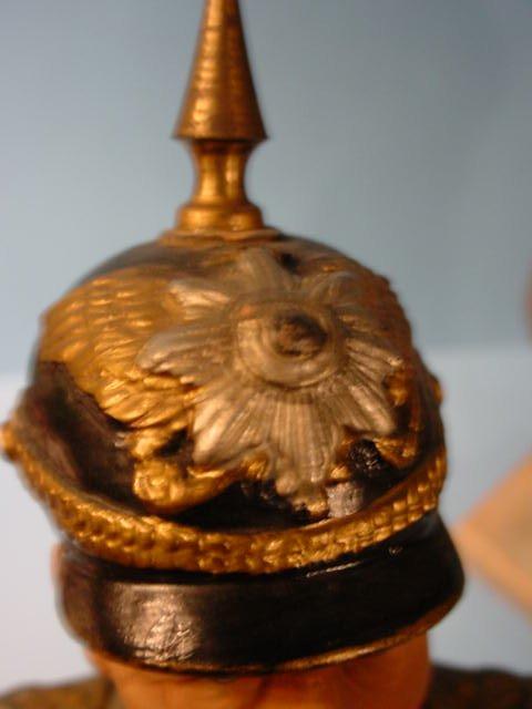 DESCRIPTION: This has to be one of the neatest WWI German novelties of the Imperial Era we have ever seen or heard of. This Pickelhaube wearing Prussian soldier is a ‘Bandsman’ and “what a bandsman.” He is playing the “Grosse Trommel” (Grand Drum) and the large cymbal at the same time. He is in full Prussian Landser uniform with the ‘Birds nest” or swallow tail epaulettes on his shoulders and the special three button style cuffs that are sported on the dress tunic. He wears the Mauser 98 bayonet with portepee. The absolute most unique thing about “Fritz’ is found in his moving parts -- when the arm holding the drum stick is depressed downward, he raises the cymbal and brings it clanging down when the drumstick is returned to its original position. Of course when the cymbal is raised the ashtray is exposed. Behind ‘Fritz’ is a small plinth where a pack of matches would be mounted. The figure is mounted on a base that is made to look like a brick street. Under the base are letters, D.R.G.M. (German registered patent) and another word is found by the base fixtures. It could be Mustersch.? The figure with base stands about 8 inches tall. The drum is about 2 ½ inches long. The cymbal is about 2 inches in diameter. We at Germania are particularly proud to offer this great figure to the collecting pubic and at the same time in hopes he doesn’t go out too soon, he looks great on our desk. In all probability ‘Fritz’ was a table piece in an officer’s Mess Hall. He is certainly not a toy. PRICE: SOLD |