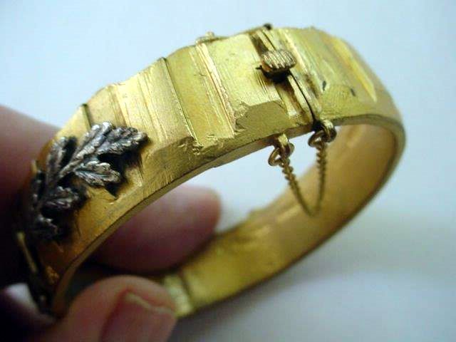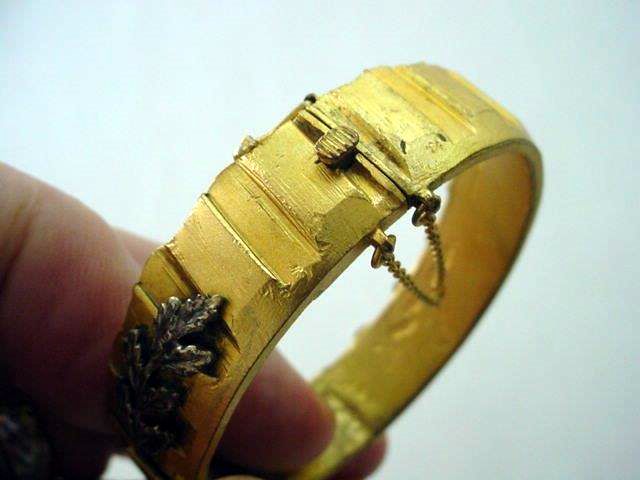 DESCRIPTION: Here is an absolutely beautiful bracelet featuring the WWI Iron Cross in enamel flanked by genuine-silver oak leaves. What makes this so unusual is that it is constructed from an actual German brass artillery shell as a remembrance of service in the war and was probably given to a wife or sweetheart by a soldier who had it made possibly by a jeweler in an occupied territory? The piece is put together in the finest of jewelry technique; an examination of the images will reveal the wonderful snap catch and chain with button for attachment or removal and the safety device also nicely installed.