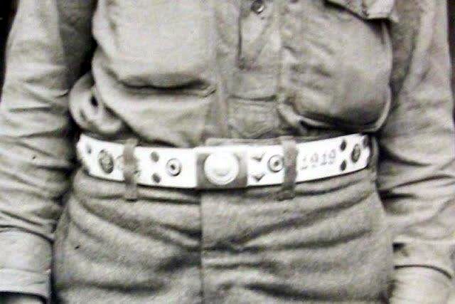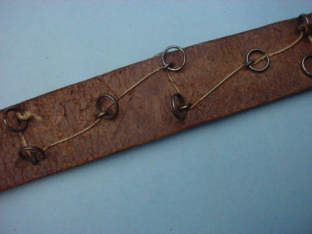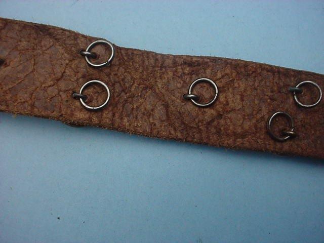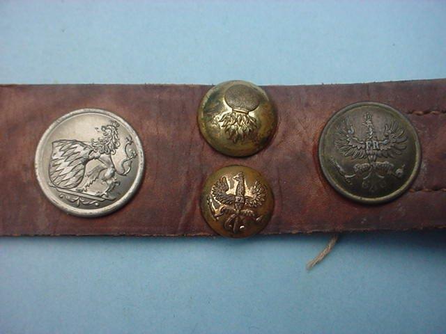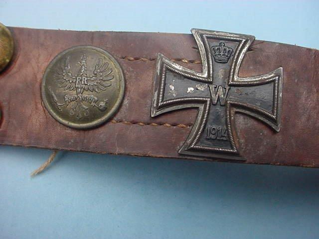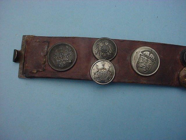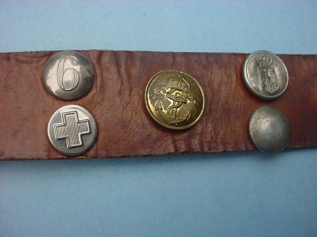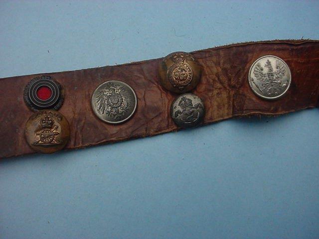 DESCRIPTION: These belts could be falsely named as they have the bad rap of being identified as belts containing buttons and badges collected in combat from dead or captured soldiers from the ranks of the enemy, but further study of the subject leads us to believe they were often simply a soldier’s collection of mostly uniform buttons that were swapped between soldiers (mostly German) who made it a hobby or pastime to put them together. This one, however, has 23 items to include 14 obviously German buttons and actually an Iron Cross, four British regimental buttons, and a single button from a Belgian Garde Civique. The leather belt itself is a German standard-issue type fitted for the German Gott Mit Uns belt buckle. Was this the collection of a German soldier or of a British “Tommy,” or could it actually be one of the rare ones with buttons from prisoners or battlefield dead? The Iron Cross leads us to the latter conclusion. WHY? Because a German soldier would hardly add this sacrosanct medal to a belt. Another answer that has been handed down from the past was that these button collections would be collected by soldiers on graves detail and that they would take a button from the body as a memorial token. In any case, these belts very seldom ever show up anymore, anywhere. They are truly historical treasures and this one world rank as one of the best examples ever turned up from the aftermath of the greatest war and greatest tragedy that the world has ever seen up until the horrible madness unleashed in WWII.