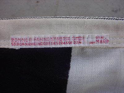 DESCRIPTION: Here is a specimen in nearly mint condition of the Kaiserreich battle flag. We are not sure if it was manufactured in the period leading to or during the First World War. It could have been produced in the 1930's or 1940's. The Veterans Associations used this ensign in all their parades and ceremonies. The condition is great and it has the label of the flag maker on its rope edge. It is a great size for the collector (53" x 31") and is a very dramatic looking flag. It has the rope running through the left side (stitched on) with the loop and tie lanyard all there. The Banner Fahne Fabrik was known to make the finest in flags and standards in the Imperial era and in the Third Reich (they made the best!) PRICE: SOLD |