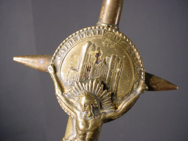 DESCRIPTION: From time to time one of these interesting items shows up. They are always unique since they are made in the field by soldiers or produced by jewelers in occupied territories from bullets supplied by these soldiers. This would appear to be the case here due to the professional touch to the base, The Christ figure, and the medallion. There was one on our site at WW1 6-15 and is still there however sold. This was a German one although the French were known to favor them as well as the British. The reason for them being produced by the soldiers is speculative. Some say it is an anti-war message that depicts religious imagery with the idea of the horrors of war (brother against brother) depicted with the debris of war and the same juxtaposition of the paraphernalia of death, with the obvious symbology of Resurrection. The one we offer could be a war souvenir from the war time effects of a German soldier who captured it from a French soldier or possibly it is in fact, the post war souvenir of a French soldier. The answer could be in the caliber and style of the bullets. We are not nomenclature experts when it comes to ammunition. In any case, they are in fact real bullets form the Great War period. Above the Christ figure is a medallion with the Cathedral of Reims Depicted. And the base is decorated with turning rays of the promise of eternity. The relic stands five inches high and the left to right bullet arms measure 2 ½ inches. A genuine piece of history from the war to end all wars. Too bad we didn’t learn from that! PRICE: $475.00 |