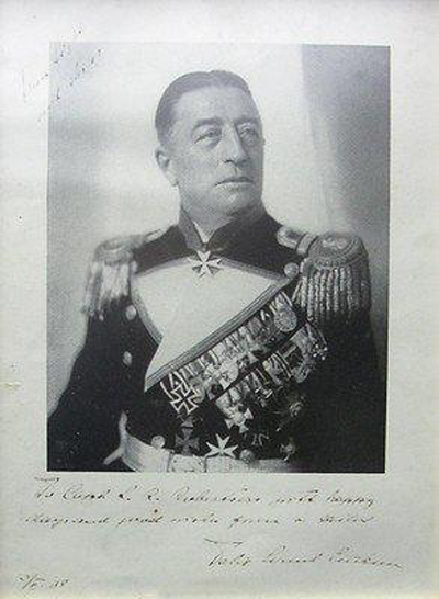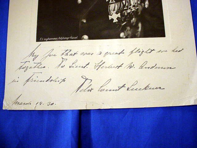 DESCRIPTION: This portrait of Count Felix Graf von Luckner was presented to a British comrade (probably a naval officer). The gentleman receiving it was a lieutenant by the name of Herbert W. Anderson. Count Luckner dedicated it to this officer with the words in ENGLISH: “By Joe that was a great flight we had together.” He signs it to: “Lieut. (Anderson) in Friendship Felix Count Luckner March 14/30.” This is particularly meaningful as it illustrates the sense of respect and chivalry that existed between two former enemies for one another recognizing bravery and comradeship of the one for the other because they were warriors each in his own cause. It seems the greatest shame that two Caucasian nations had to try to destroy each other for absolutely no good reason--twice! Size is 8 x 11 inches and is in good condition. PRICE: $500.00 |