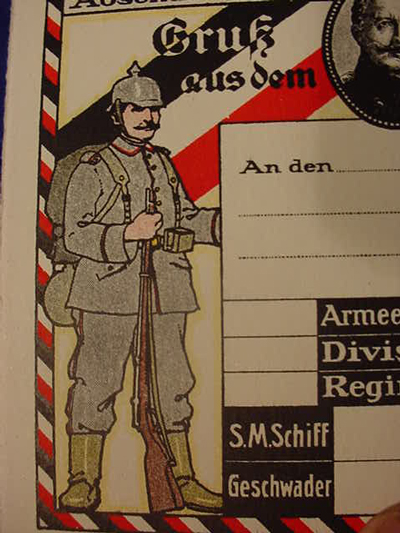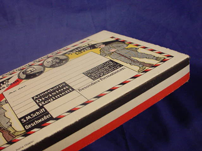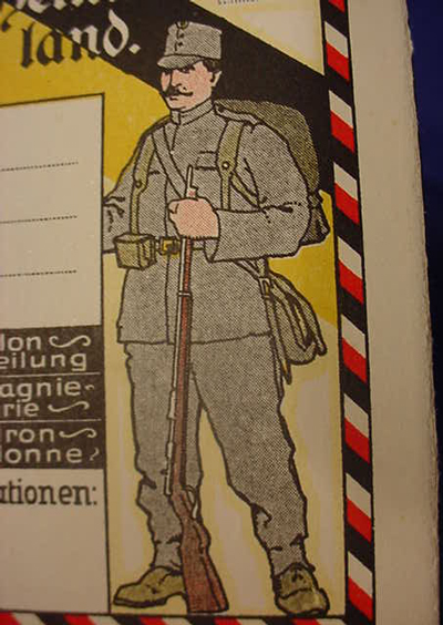 DESCRIPTION: We managed to find four of these beautiful mailing boxes that were issued to soldiers of Germany and Austria. They were for the soldiers in the field to send home letters, notes, souvenirs, etc. They are measured at 7 x 5 inches and are 1 ½ inches deep with the Austrian and German soldiers depicted with their colors behind them. Also seen is a picture of Kaiser Wilhelm II and Franz Joseph of Austrian side by side in portrait style while in the middle you can see the lines to be filled out as to address and destination and other lines for military identification of the sender. Across the top is written Feldpost-Brief Paket. (Field post letter packet). They are in mint condition and truly rare but a package of them was recently found (never issued). A great souvenier of the Great Fratricidal war. PRICE: $60.00 each (a bargain!) |