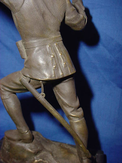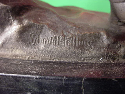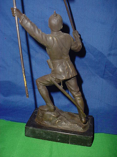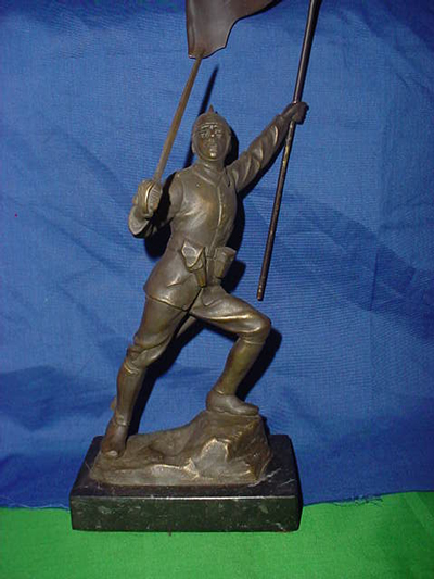 DESCRIPTION: This is a bronze sculpture by famed Paul Schmidt Felling 1835 - 1930. He was one of the most famous artists doing human figures in his time. Farmers, children, workers, soldiers and some animal figures, he was a very prolific artist and was most known for his very dramatic figures but also his Volkskunst(Art of the People). This example is a patriotic theme with a soldier of the Fatherland in the pose of officer holding the schwarz, weiss, rot banner as he advances with drawn sword. The officer seems to be rallying the troops for a charge against the enemy. The banner is seen to be divided into sections that, were they in color, they would be the national colors of black, white and red. We have seen a larger version of this Felling statue in a German art museum and it had the name ‘Vorwarts’ or ‘Forward.’ Certainly an appropriate title for this extremely melodramatic figure that is so striking and full of meaning to the Germanophiles among us. PRICE: SOLD |