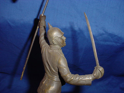 DESCRIPTION: This is a magnificent bronze depiction of a mounted horseman of the Fifth Uhlan Regiment of the Kaisers 3rd Cavalry Division attached to the First German Army Command. They served with particular distinction in the Franco Prussian war and WW1. Uhlans were light cavalry, actually Lancers, who fought with carbines, swords, and lances. The title Uhlan was used by Lancer regiments in the Russian, Austrian and especially the Prussian armies. Uhlans typically wore a double buttoned tunic (Kurta) with a colored panel at the front, a colored sash and a square topped Lancer cap (Czapka), also spelled chapka. This cap was originally derived from a traditional design of the Polish civilian cap made more formal and stylized for military use. Their Lances usually had small swallow tail pennants known as the Lance Pennon that was found just below the spearhead (see our pictures). Prussian Uhlans distinguished themselves and fought bravely in the war against Napoleon. In WW1 the Imperial German Army included 26 Uhlan regiments. They all saw action while on duty at the first part of the war and their charge with lances struck fear in the hearts of the enemy since it has well been known that these were formidable warriors adept at warfare (up front and personal!). Later in the second year of the war the Uhlan regiments were either dismounted to serve as cavalry rifle regiments in the trenches of the western front or transferred to the eastern front where primitive conditions made it still possible for horse cavalry to play an effective role. In WWII a popular myth is that Polish cavalry armed with lances charged and were annihilated by German tanks during the 1939 campaign; this arose from the misreporting (both intentional and unintentional) of the charge at Krojanty on 1 September when two squadrons of Polish 18th Lancers armed with lances and sabers were met in combat by German cavalry led by Harry Von Johnston in what was the last charge of German cavalry with sabre. The Poles were dispersed and defeated by Germans who rode one last time in the spirit of the Old Prussian Uhlans. This is a little known fact of history that for the most part has remained hidden for all these years. The bronze statue is accurate in every detail and prodigiously dramatic in its heroic depiction. It is a huge and heavy sculpture done in the finest mode of German bronze art. It measures 26 inches high from the bottom of the base to the top of the Uhlan Czapka. The horse is 22 inches long from tail to muzzle. The base is measured at 19 ½ x 7 inches. The sculpture is signed by Leon Mignon (1847-1898), a sculptor from Brussels, Belgium. He studied under the sculptor Prosper Drion (1822–1906) at the Académie in Liège from 1857 to 1871. He was a particular admirer of the anecdotal sculpture of Léopold Harzé (1831–1893). His vocation as a sculptor of animal subjects began in Rome, where he studied on a grant from 1872 to 1876. He exhibited in Ghent (1874) and on several occasions in Paris (where he lived from 1876 to 1882) at the Salon des Artistes Français. He achieved prominence at the exposition Universelle of 1878 in Paris with his bulls fighting in the Roman countryside (Brussels, mus. a. mod.). In 1880–81, he shared a studio with the Belgian sculptor Paul DeVigne, whom he had met in Rome. Mignon’s bull tamer (liège, parc avroy) took the gold medal at the Salon of 1880. In 1882 he settled in Brussels and in 1888 produced the labors of Hercules reliefs for the stairway of the palace of Charles de Lorraine (now part of the Bibliothèque Royale Albertier). He sculpted several historical figures for the provincial law courts and was an astute philosopher of his time. In 1892 he sculpted many subjects for the Université de Liège. He excelled as a sculptor of animal subjects. Mignon occupies a leading place in Belgian realist art. He also modeled busts of Belgian personalities as well as a statuette of the Belgian painter Hubert Bellis; figurines of workers, soldiers from the Belgian regiments (c. 1889), and even an equestrian statue of a Prussian Uhlan, France’s enemy in the 1870 war; and a statue of Leopold in 1886 ( Brussels, mus. a. mod.). His works are preserved in the Musée de l’art Wallon, Liège, and the Musée d’Art Moderne, Brussels. He was completing a frieze for the Hôtel Somzée in Brussels when he died unexpectedly. He was an amazing artist and a cultured man of vision. A grand museum grade art piece personified and extraordinaire! It is priced under market value for a sculpture as fine as this one is. It is certain that one could not find any such dramatic artistic accomplishment to rival this one. Here he is! In all his Imperial glory. Listen as you view him and perhaps, just perhaps, you will hear the strains of “Heil Dir im Seigerkranz” (Hail to thee in Victors Crown.) Deutschlands Helden Lebt in ewig leben! PRICE: SOLD |