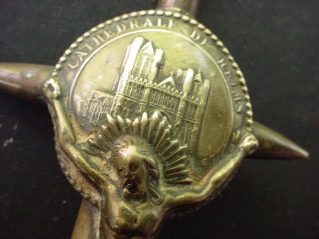DESCRIPTION: This is a great piece of trench art from the terrible battles around Reims, France, during WWI. It commemorates the Reims Cathedral known as the Notre-Dame de Reims. Close to the eve of WWI, the Germans severely bombarded this magnificent edifice. The bombardment was not intended or planned; it was just an unfortunate casualty in a war that should not have ever started in the first place. The fighting was most intense in the Reims area. War is hell!, but fratricidal war is sheer hell! . There should never be another “brothers” war. This little hand-made souvenir was made from actual rifle cartridges and carried by some French poilu, who probably cherished it through the French participation in the terrible conflict that followed. Above the corpus depicted on the cross that is comprised of is a beautiful picture of the cathedral of Reims before its destruction. The name of the famed edifice is spelled out and pictured. The entire cross is built with two rifle cartridges and two bullets. This is a true and genuine war memento from the trenches.