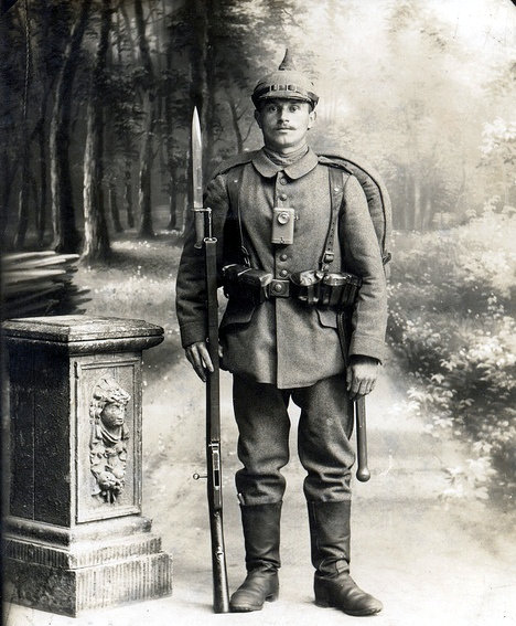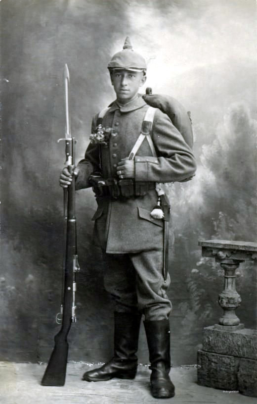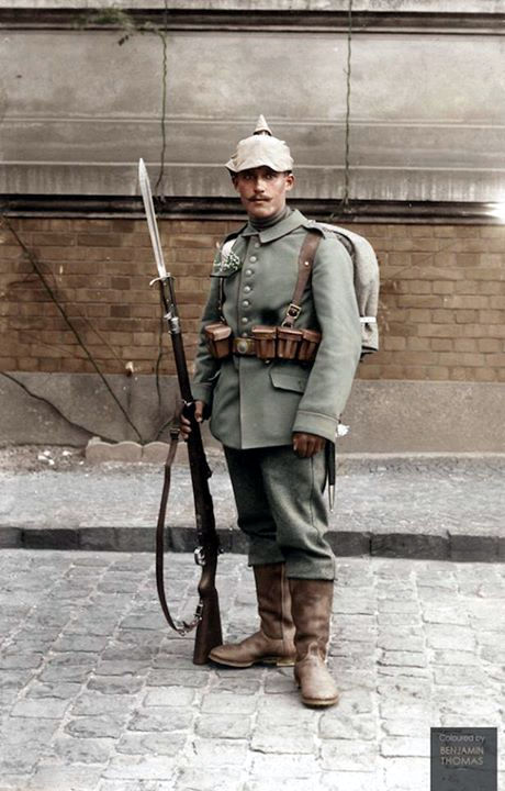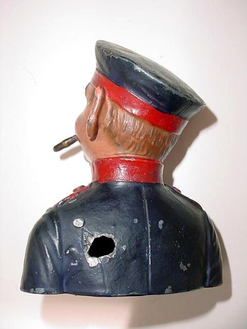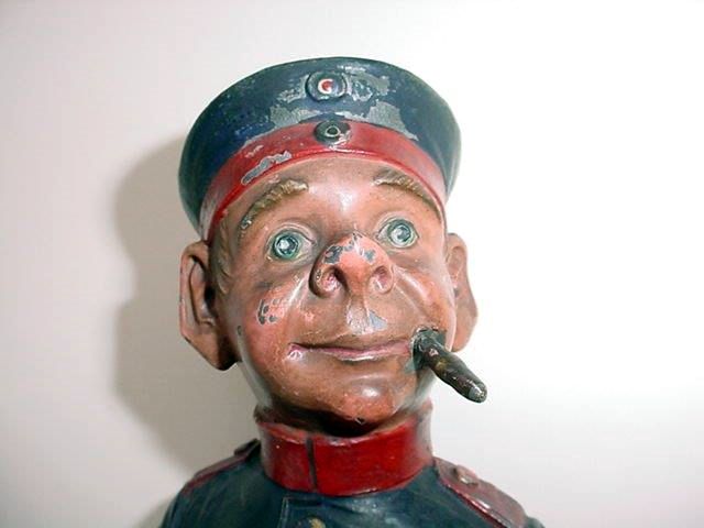 DESCRIPTION: Here is Fritz, der gute deutsche Soldat (The good German soldier). In Germany, children’s books of the period 1890s through 1915, Fritz was a favorite cartoon character who exemplified the humorous side of the life of the German soldier (Soldatenleben). He was generally depicted as you see him here, but usually without the cigar. German tobacco dealers took a liking to Fritz and they featured statues such as this on the shelves that featured their tobacco product, so Fritz took up the bad habit. However, he does seem to be enjoying that cigar. He’s wearing the typical garb of the enlisted German soldier with all colors correct to the regulations, and proper cap and shoulder boards. He is 4 ½ inches high and the base is 2 ½ inches wide. He measures 3 ¼ inches across the shoulders. He dates around 1914 and for his age of 102, he is in very good shape. He must have eaten a lot of sauerkraut and washed it down with good Bavarian beer. When you view his backside there is a small hole on the left near the sleeve. Why? How? We don’t know, but thank goodness it’s on the back, because Fritz likes to be viewed from his front. There are no manufacturer’s marks. He is constructed in a white-metal European alloy. Fritz is a happy fellow, but I guess at this point he didn’t know he was about to enter the fray of the horrible genocidal war that his Fatherland was thrust into by forces of evil that sought to bring white, western culture to an end. If they failed that time, they certainly succeeded the second time around, didn’t they? But for now, let’s enjoy the moment with glücklich Fritz. I can tell he likes you, and wants to be your kleine, glücklich deutsche Soldat.