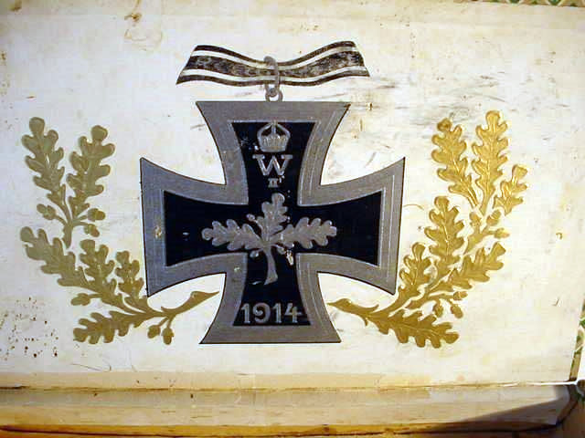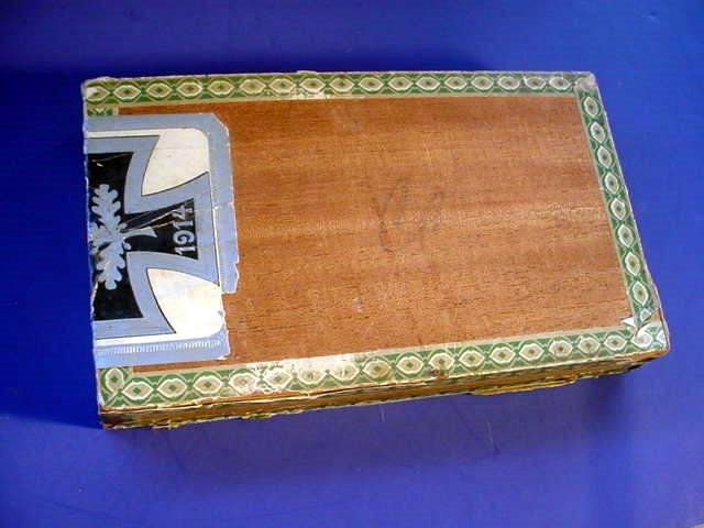 DESCRIPTION: Here is a lovely cigar box that is labeled on its top “Das Eiserne Kreuz 1914”—“The Iron Cross 1914.” The box measures 8½ x 7 inches and is 1¼ inches deep. Above the words on the lid is a small picture of the Iron Cross. When opened there is a large Iron Cross of 1914 with ribbon and beautiful gold, oak-leaf clusters on the underside of the lid. The box we would say is in remarkable shape except for some of the paper covering is nicked and torn here and there, but as can be seen in the images, this item, though more than a hundred years old, has for the most part stood the test of time. Yes, he is fragile and he asks some genuine Germanophile, who is a collector, to give him a respectable place to rest while reflecting for better or worse the history of that “Great War” to end all wars!