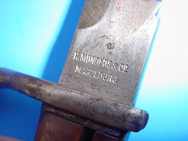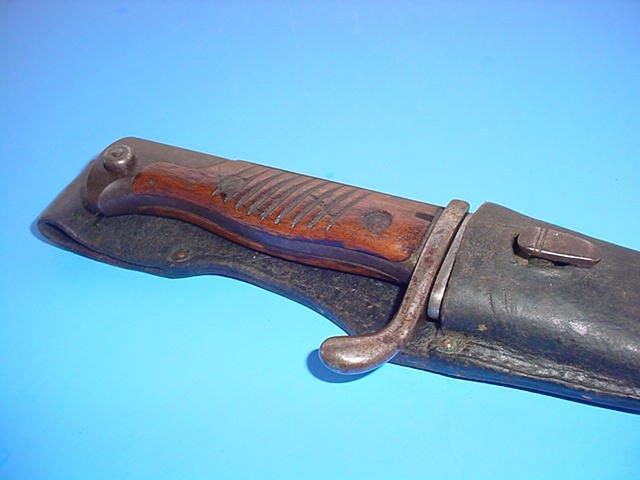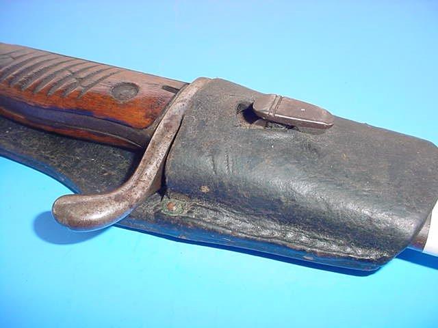 DESCRIPTION: This is a rare and genuine early example of the famous ersatz crank handle bayonet. This is one of the few ersatz bayonets for which a maker is attributable: “DEMAG” (Deutsche Maschinenbau-Aktiengesellschaft) in Duisburg, Germany. It produced these bayonets between 1914 and 1918. The maker’s mark is stamped on every blade. It has a 148-mm double-edged blade that is in good condition. These bayonets were designed to fit the G98 rifle and sometimes had a modified crossguard to fit on the export pattern Mauser 98 rifle. The hole in the crossguard is to allow a clearance for the rifle’s cleaning rod to slip into. These fighting knife/bayonet combinations were at the beginning of WWI. Fakes abound, but this one is 100-percent genuine and guaranteed! Quite rare in the fact that the leather hanger is intact and the snap button actually works fine.