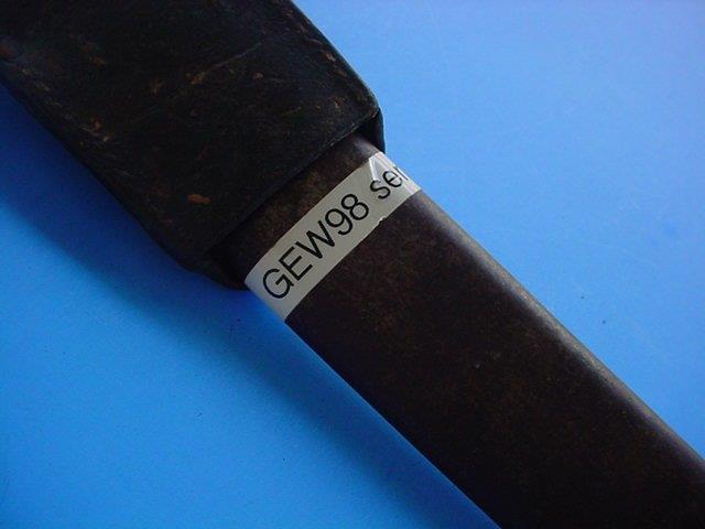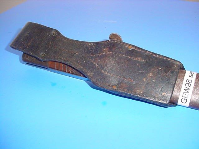 DESCRIPTION: German troops carried this very fine example of a saw-teeth bayonet and used it mainly for cutting down pole work that held barbed wire in position. However, it was also, after all, a bayonet and used in trench warfare. Later it was made illegal in the warfare conventions. The serrated/sawtoothed edges would not allow a wound to coagulate. This is a big weapon measuring a little over 20 inches when in its scabbard. The blade measures 14 inches. The grips are of wood and the maker is H. Mundlos & Co. in Magdeburg. The bayonet also includes the leather frog. A former collector attached a band just below the frog that says “GEW.98 ser. No. 2727.” This band is removable, of course. The entire piece is in great condition for its very advanced age. The blade has some cleanable minute rust spots.