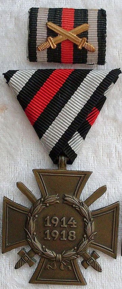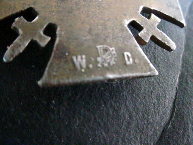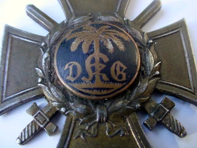 DESCRIPTION: At the end of WWI, the German government at the directive of General Field Marshal Paul von Hindenburg instituted and established a medal to be given to all participants in the war. The name of this award was the Honor Cross of the World War (Das Ehrenkreuz des Weltkriegs 1914-1918). The medal was instituted on July 13, 1934, and was to commemorate the distinguished deeds of the German people in the former war. Shortly after its issuance, the NSDAP government declared the award as the only official service decoration of the First World War to be worn on any military uniform of a state and NSDAP uniforms. Now we offer here the Ehrenkreuz der Deutsche Kolonialgesellschaft (Honor Cross of the German Colonial Society). This basically was a society whose main goal was to work for a more expansive German colonial policy. From 1916, plans were made for a German Colonial Empire in Africa: Deutsche Mittelafrika was the theme. After Germany lost its colonies at the end of the First World War the Society propagated for their reoccupation. When the Nazi Party seized power in Germany the Colonial Society was dissolved and Colonial matters became the task of the Reichskolonialbund. This was the collective body that absorbed all German colonial organizations during the time of the Third Reich. This was a very much more efficient organization that the former DKG. The medal that we offer here is extremely rare. It is the Honor Cross issued by the Deutsche Kolonialgesellschaft. It is much like the Hindenburg Honor Cross in shape and dimension, but in its center is the symbol of the DKG; i.e., the palm tree with the letters “DKG.” This particular one is with swords that indicate the soldier honored was a combatant. This was the only diversion known from strict Germanic protocol. The ribbon was exactly the same as featured on the Hindenburg Cross. At the back of the award at the bottom, you can see the initials of the company that manufactured the crosses (“WDC”). It is most interesting that the middle initial “D” has a winged insect flying through it (clever). In all our years in this field, we have never seen another example of this rare medal, but we have seen an enameled stickpin with this logo on it. This is extremely rare, but reasonably priced.