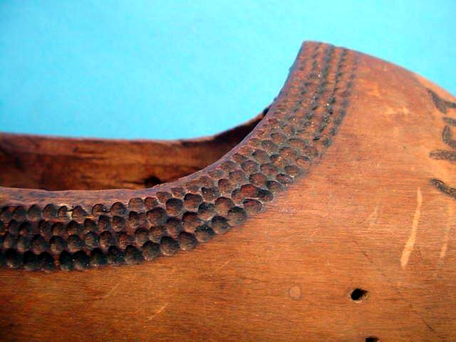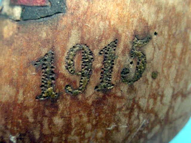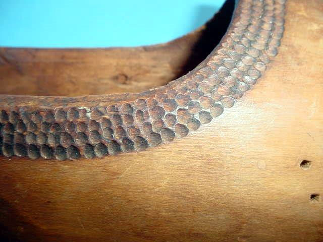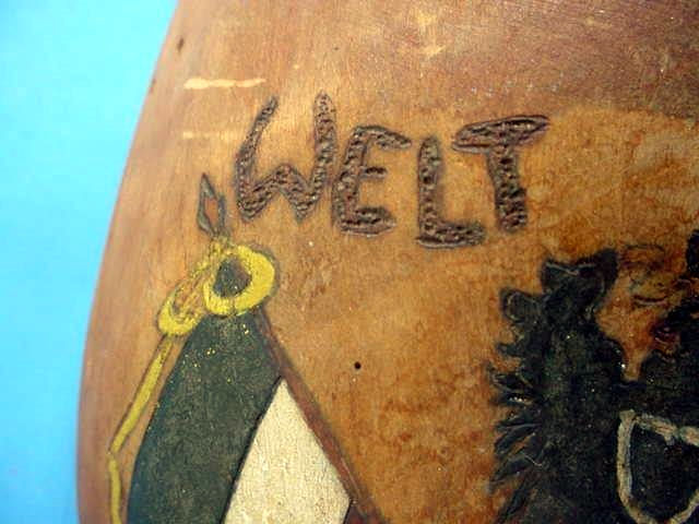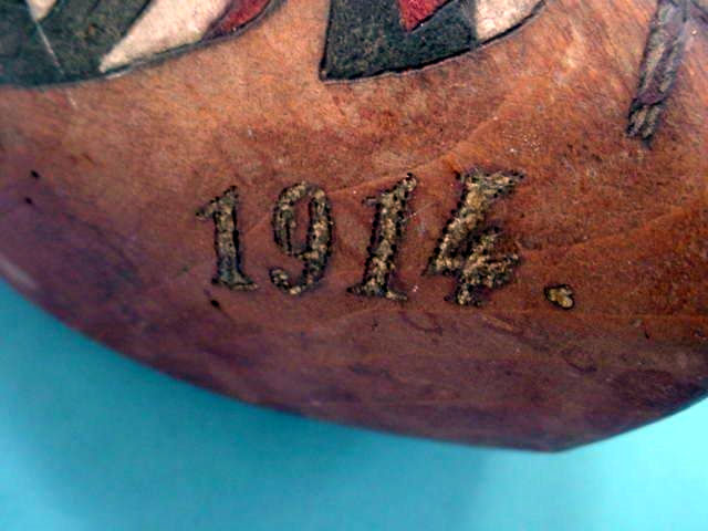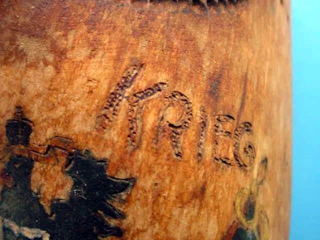 DESCRIPTION: „Im Sommer, Kühl; Im Winter, Warm.“ When most think about wooden shoes they think Dutch/Holland, but they don’t usually realize that in Germany in the Westphalia area the people there have worn wooden shoes for centuries. There are ancient folk tales in Westphalia of the witch who trampled the devil and thwarted Hell with her feet firmly encased in huge wooden shoes. We can find surnames in the twelfth and thirteenth centuries formed from the occupation of wooden-shoemaker people with the surnames Holzehuber and Holzemacher. They were no doubt skilled craftsmen at one time making custom-fitted and durable wooden footwear at just the right price for the area farmers. The shoe we offer comes from that Westphalia area and is a souvenir of the First World War. The maker of the shoe has carved an Imperial German eagle that is seen above two crossed German flags and above this are the words “Welt” and “Krieg.” Under this are the dates “1914” and “1915,” for the years that the former owner served his fatherland. The rim of the shoe is decorated in typical checkered pattern. This is a full-sized wooden shoe, not a miniature. Part of the word “Krieg” is rather worn and light, but still can be seen. Someone over the years has added a short bar device to the back heel of the shoe so it can be hung on the wall for display. This is obviously a very different war trophy. I have never owned one before in all the years in this business. This is an unusual souvenir piece of the Great War.